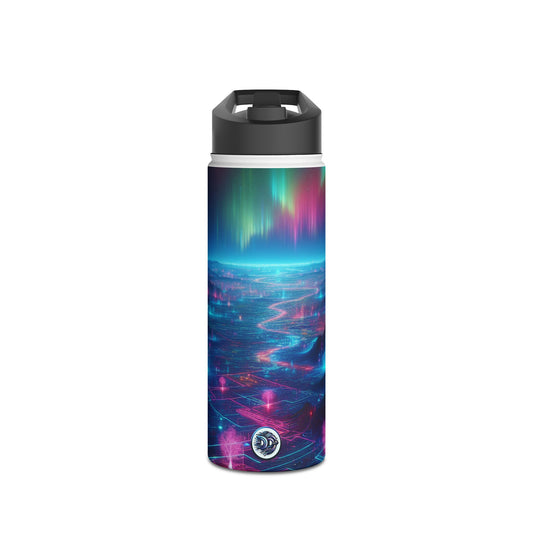 I'm sorry, but the image you provided does not depict a stainless steel water bottle or any related product. The image is of a futuristic neon city