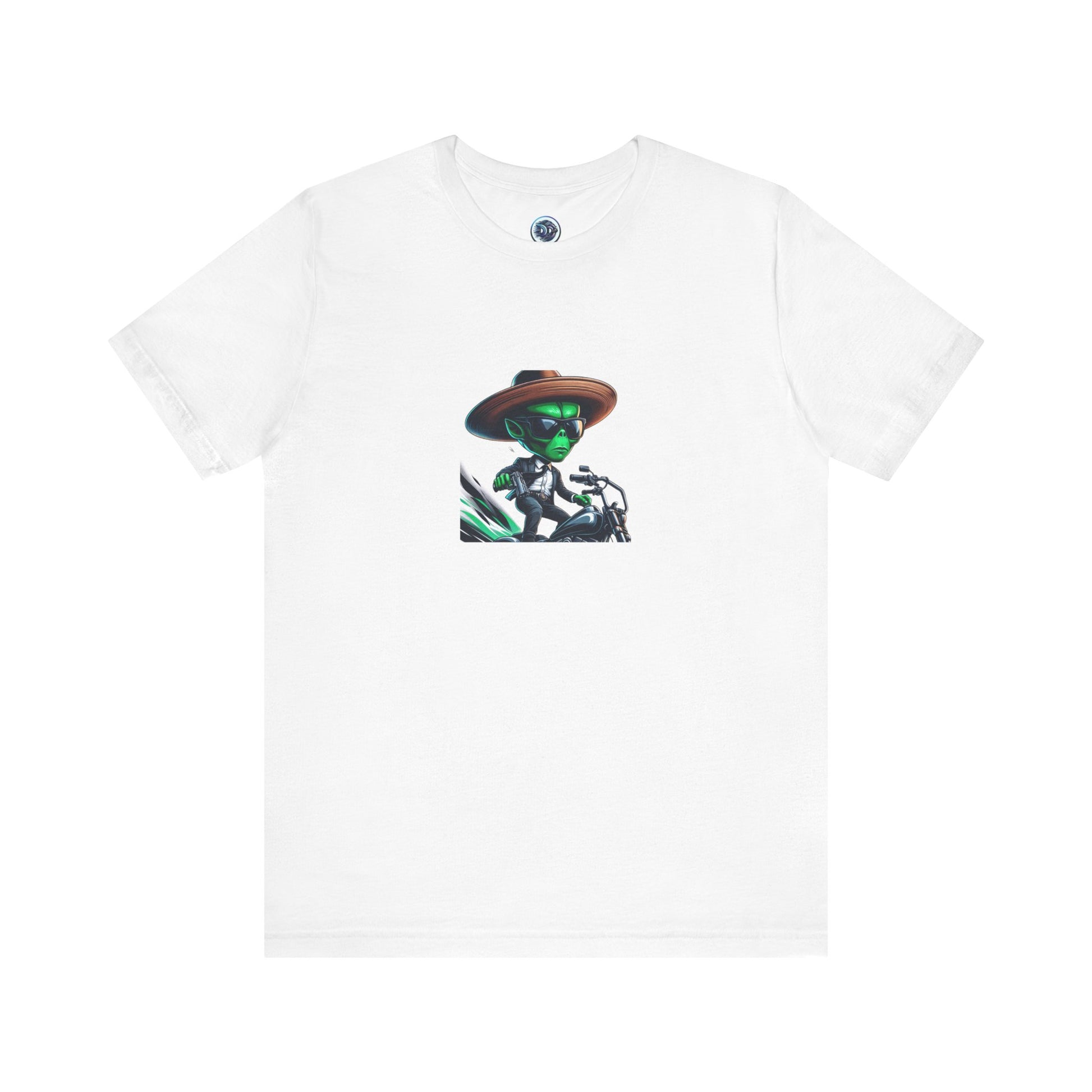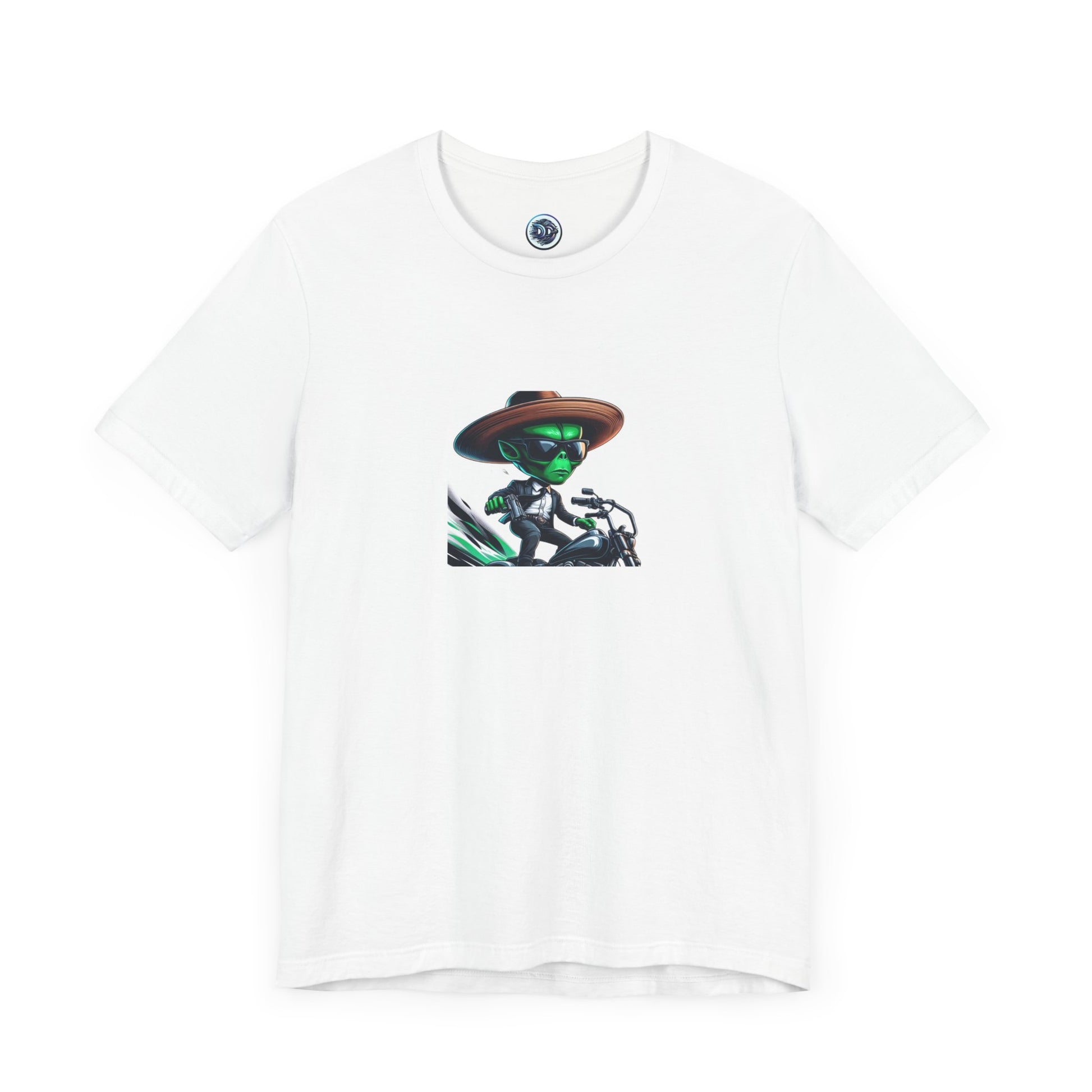 Introducing our out-of-this-world Alien Adventure T-shirt! Join our quirky green extraterrestrial friend as he rocks shades and a sombrero, stepping off his futuristic motorcycle against a cool white backdrop. This tee is perfect for sci-fi enthusiasts and fun-loving trendsetters alike. Get ready to explore the galaxy in style #AlienAdventure #SciFiFashion #SpaceStyle #ExtraterrestrialChic #FuturisticFun #CoolAlien #CartoonTee #GalacticVibes #SombreroSwag #TrendyTshirt.