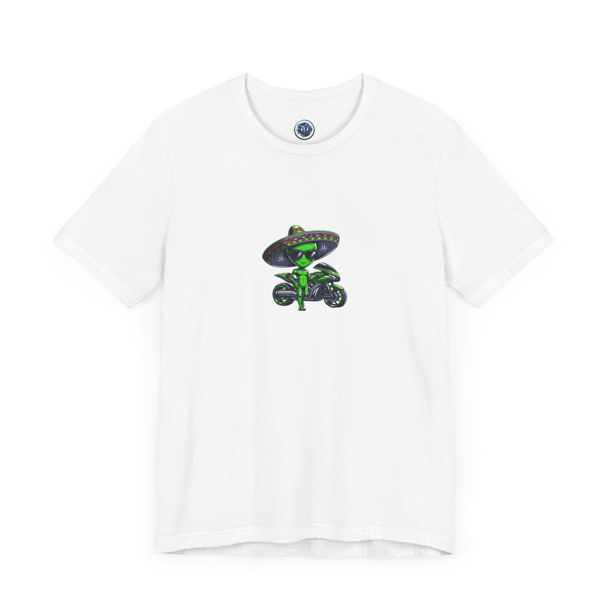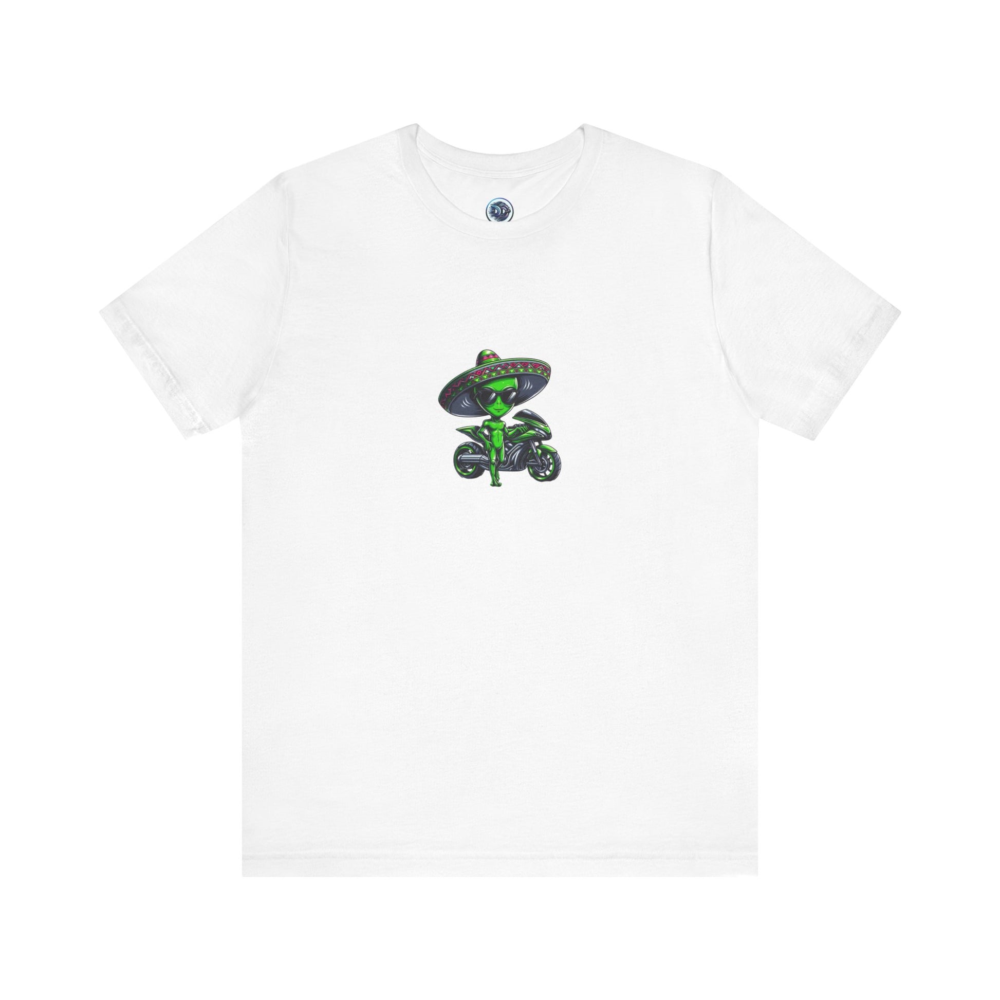 Introducing our latest tee: a cool green sci-fi alien with shades and a sombrero, cruising off his futuristic motorcycle onto a galactic adventure. This ultra-soft shirt is out of this world! #SciFiFashion #AlienStyle #FuturisticDesign #CoolTee #UniqueGraphics #SpaceFashion #ExtraterrestrialChic #SciFiAlien #TrendyTee #GalacticAdventure