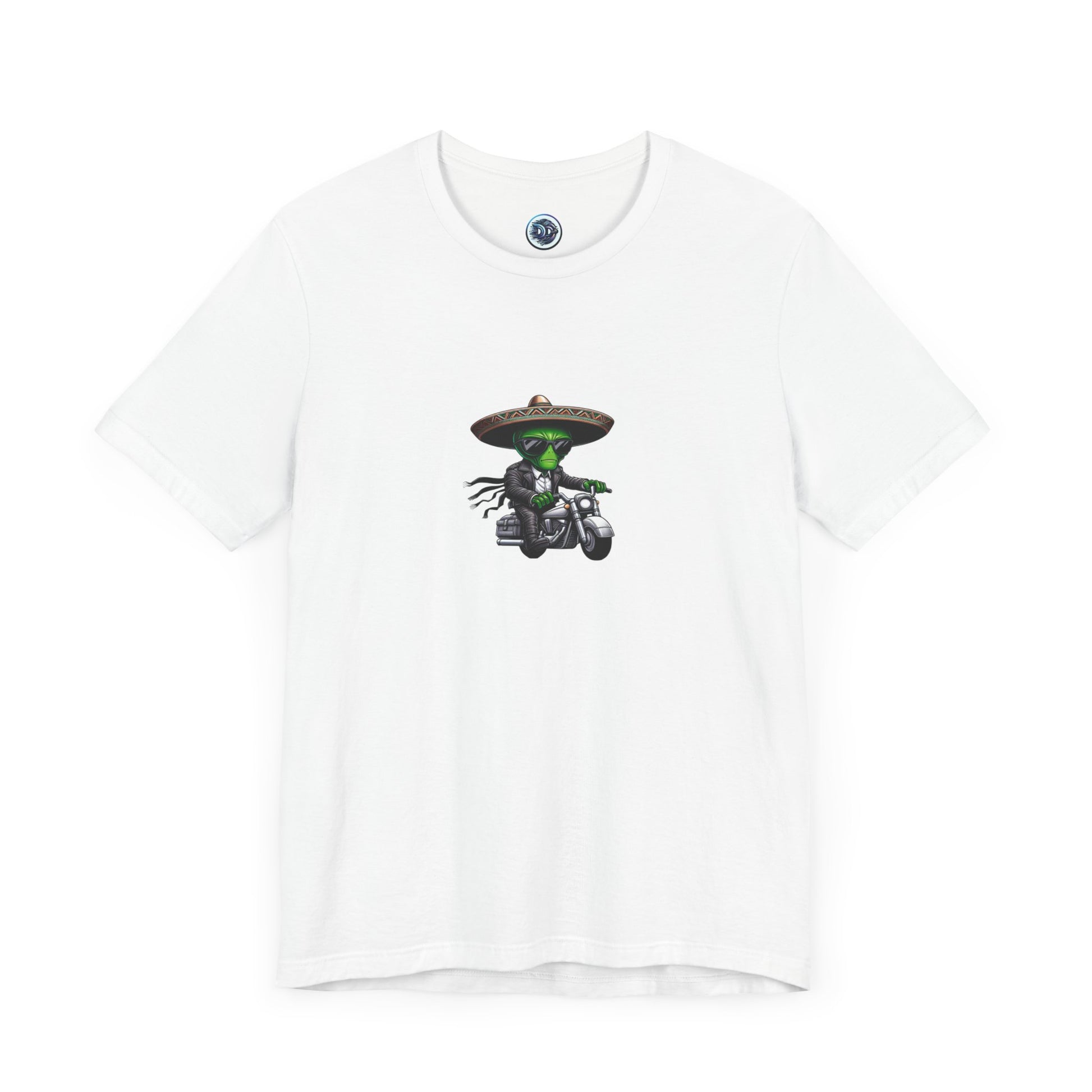 Introducing the coolest alien in the galaxy! Our sci-fi green alien cartoon character is rocking shades and a sombrero as he casually steps off his futuristic motorcycle. Stand out from the crowd in this unique and edgy t-shirt. It's perfect for sci-fi fans and fashion-forward individuals alike. πΈπΆοΈππ½ #AlienFashion #SciFiTee #CartoonStyle #FashionForward #AlienArt #UniqueDesign #GalacticStyle #CoolTshirt #FuturisticFashion #SpaceChic