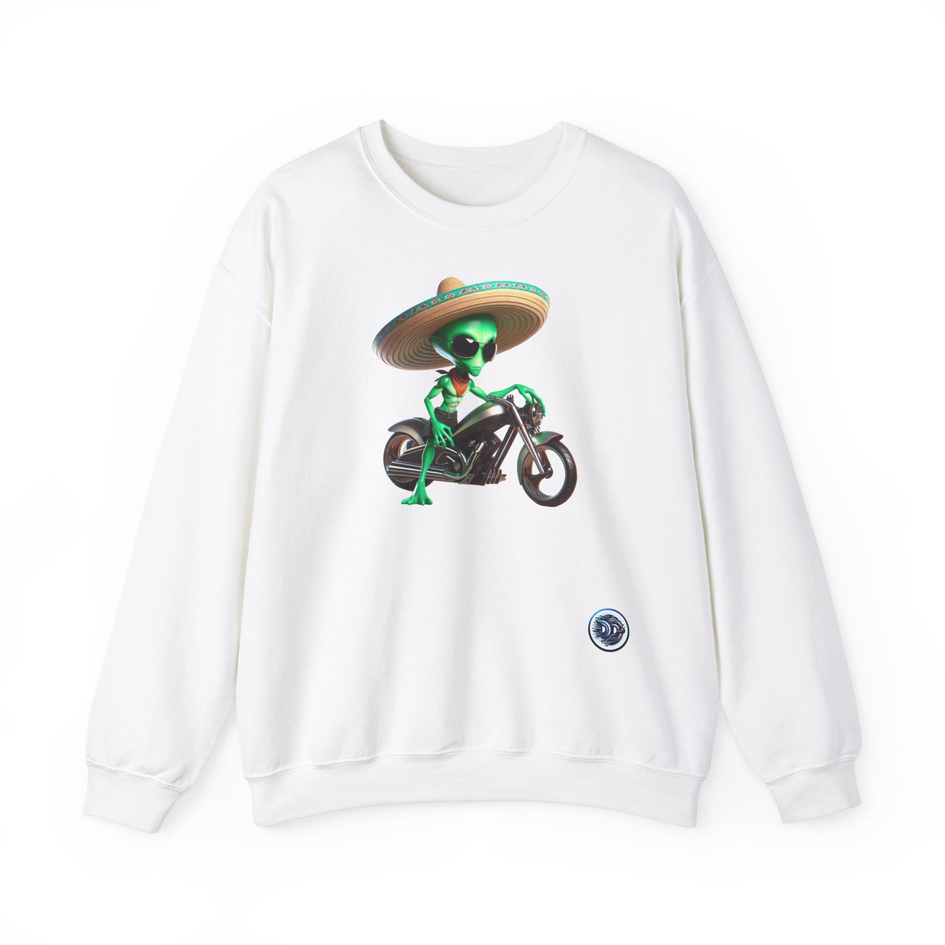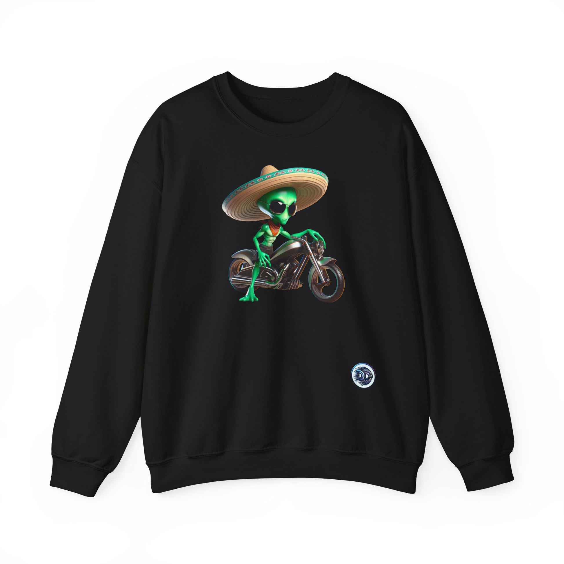 "Step into the future with our trendy crewneck featuring a stylish green alien sporting shades and a sombrero, stepping off his futuristic motorcycle. Stand out with this unique design on a cozy crewneck. Make a statement with this out-of-this-world look! #AlienFashion #SciFiChic #ExtraterrestrialStyle #SpaceStyle #FuturisticCool #TrendyCrewneck #AlienArt #UniqueDesign #StatementPiece #CrewneckPerfection"