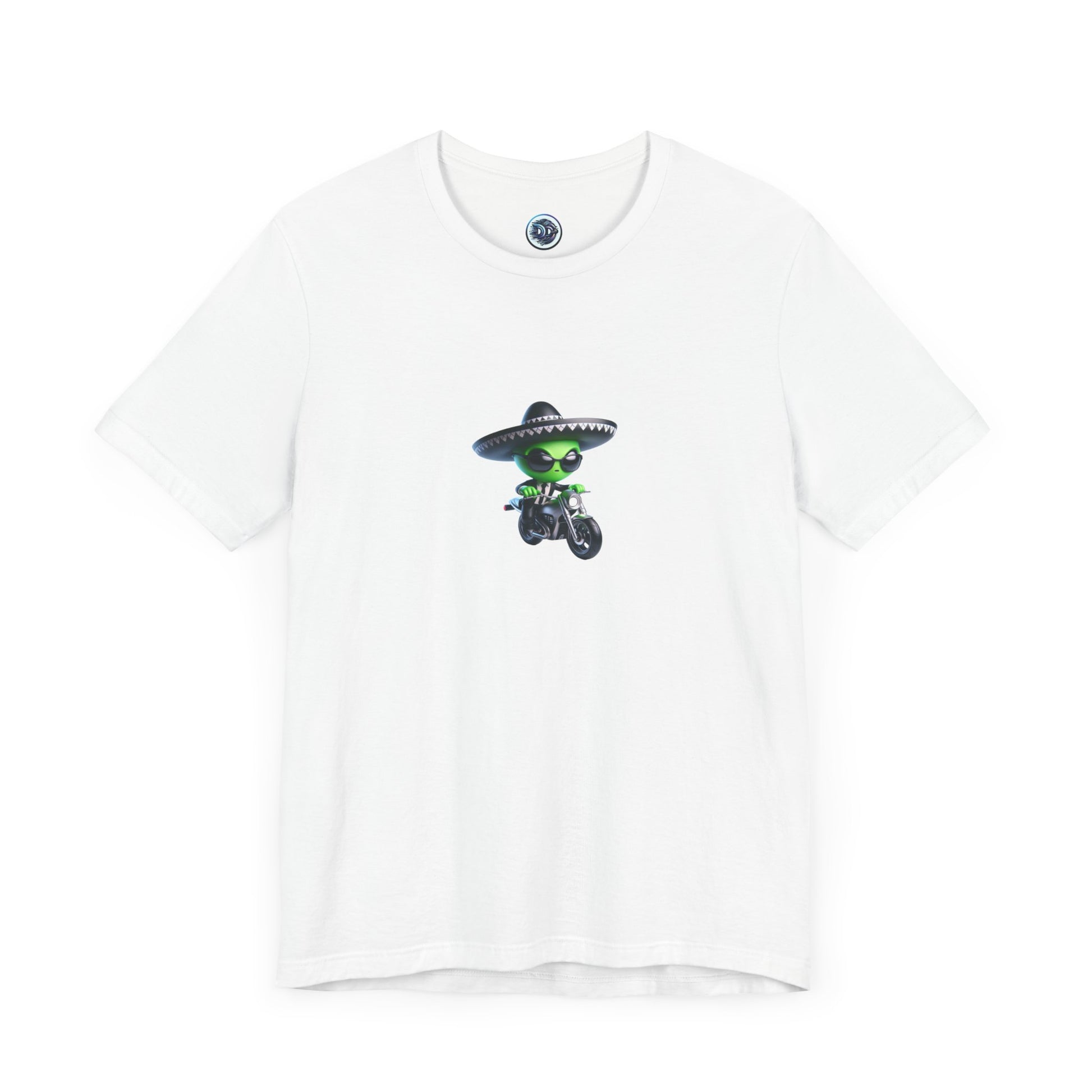 Introducing our fun and stylish Sci-Fi Alien T-shirt! This eye-catching design features a green alien cartoon character rocking shades and a sombrero, stepping off his futuristic motorcycle. The white background enhances the vivid colors of this unique tee. Stand out from the crowd with this quirky and cool shirt! #AlienFashion #CartoonTee #SciFiStyle #UniqueDesign #FunShirt #AlienArt #FuturisticLook #CoolAlien #SombreroStyle #GreenAlien