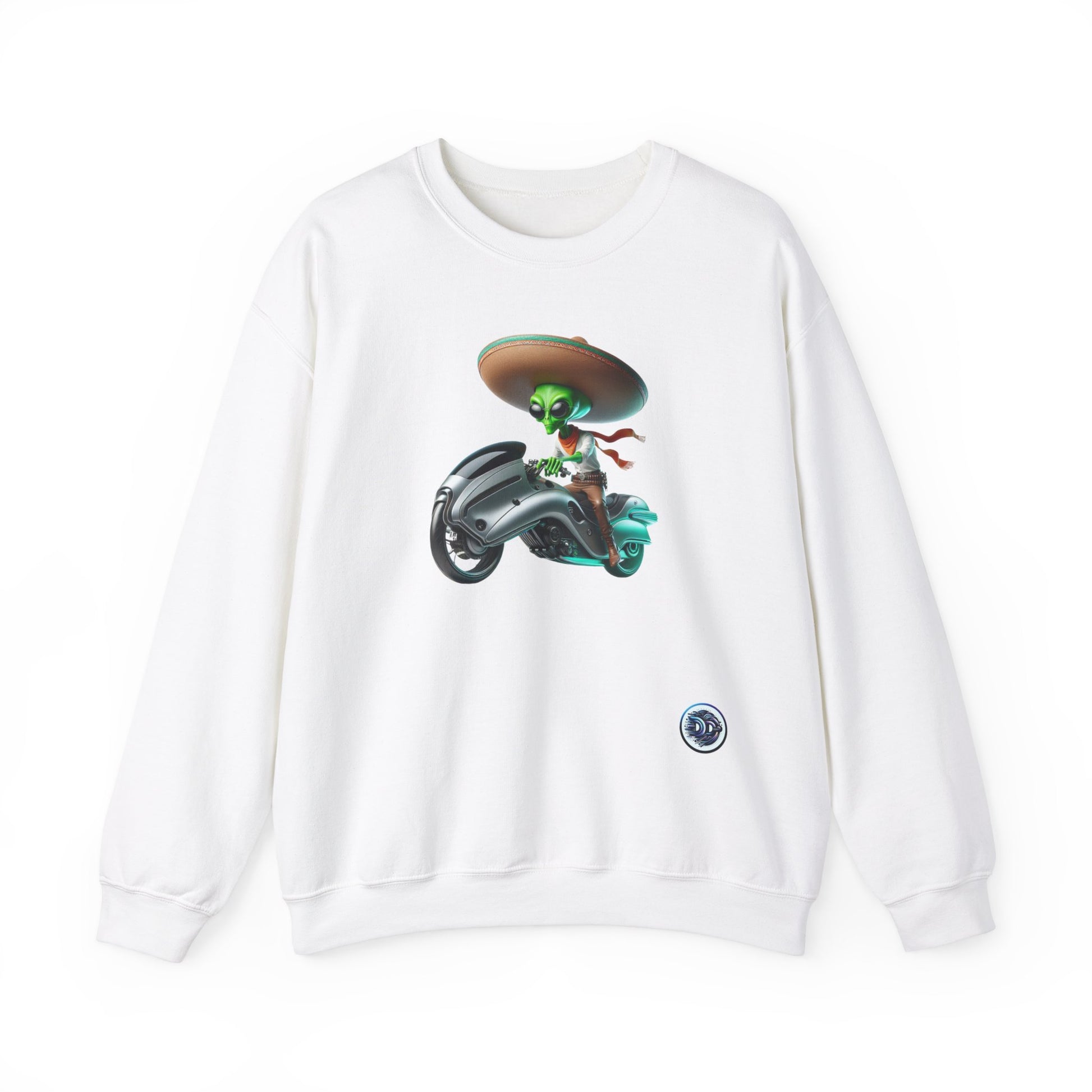 "Get ready to blast off with our limited edition crewneck featuring a cool green alien sporting shades and a sombrero! This quirky character is stepping off his futuristic motorcycle into your wardrobe. Made for the trendsetters, this crewneck is out of this world! Bold, vibrant colors on a white background design complement this stylish piece perfectly. Elevate your look and embrace your outer space vibes with this unique design. #AlienFashion #SciFiStyle #CartoonCrewneck #ExtraterrestrialTrend #FuturisticWear #CoolCharacter #SpaceVibes #LimitedEditionPiece #FashionForward #UniqueDesign"