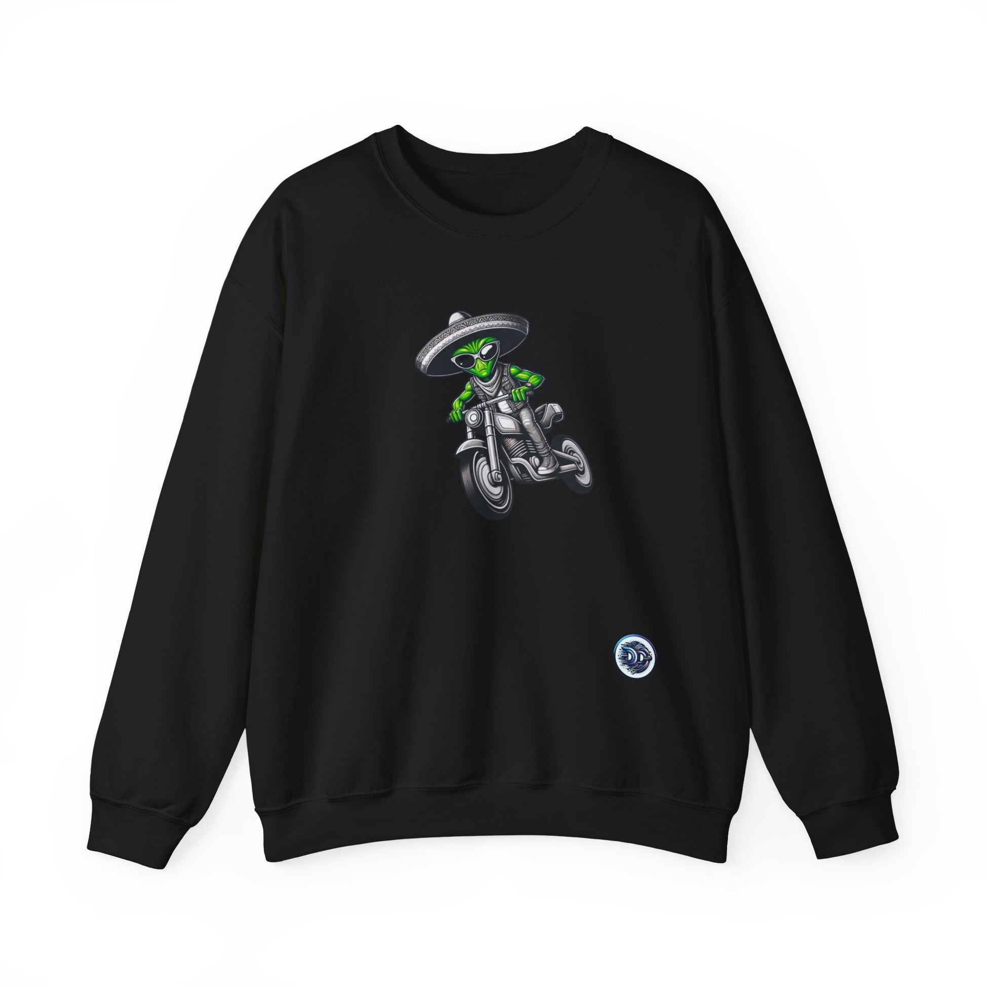Introducing our sleek and stylish crewneck featuring a fun and quirky green alien cartoon character in shades and a sombrero! Witness him confidently stepping off his futuristic motorcycle in this eye-catching design. Made from premium materials for supreme comfort and style. Perfect for sci-fi enthusiasts and trendsetters alike! #AlienFashion #SciFiStyle #CoolAlien #FuturisticFashion #CrewneckSweater #UniqueDesign #CartoonCharacter #SombreroStyle #AlienAdventure #FashionForward