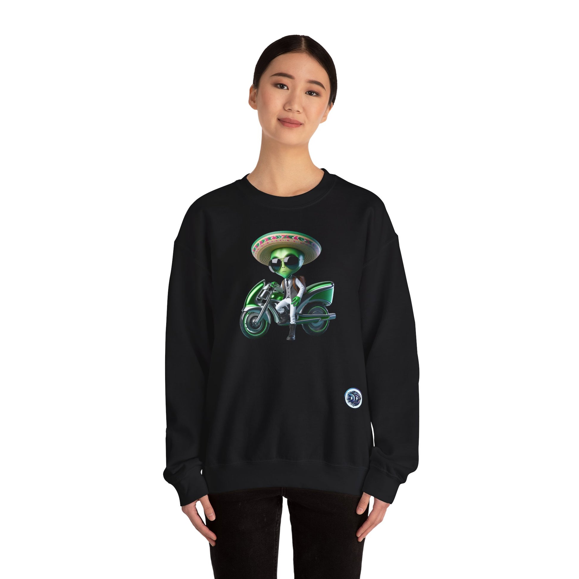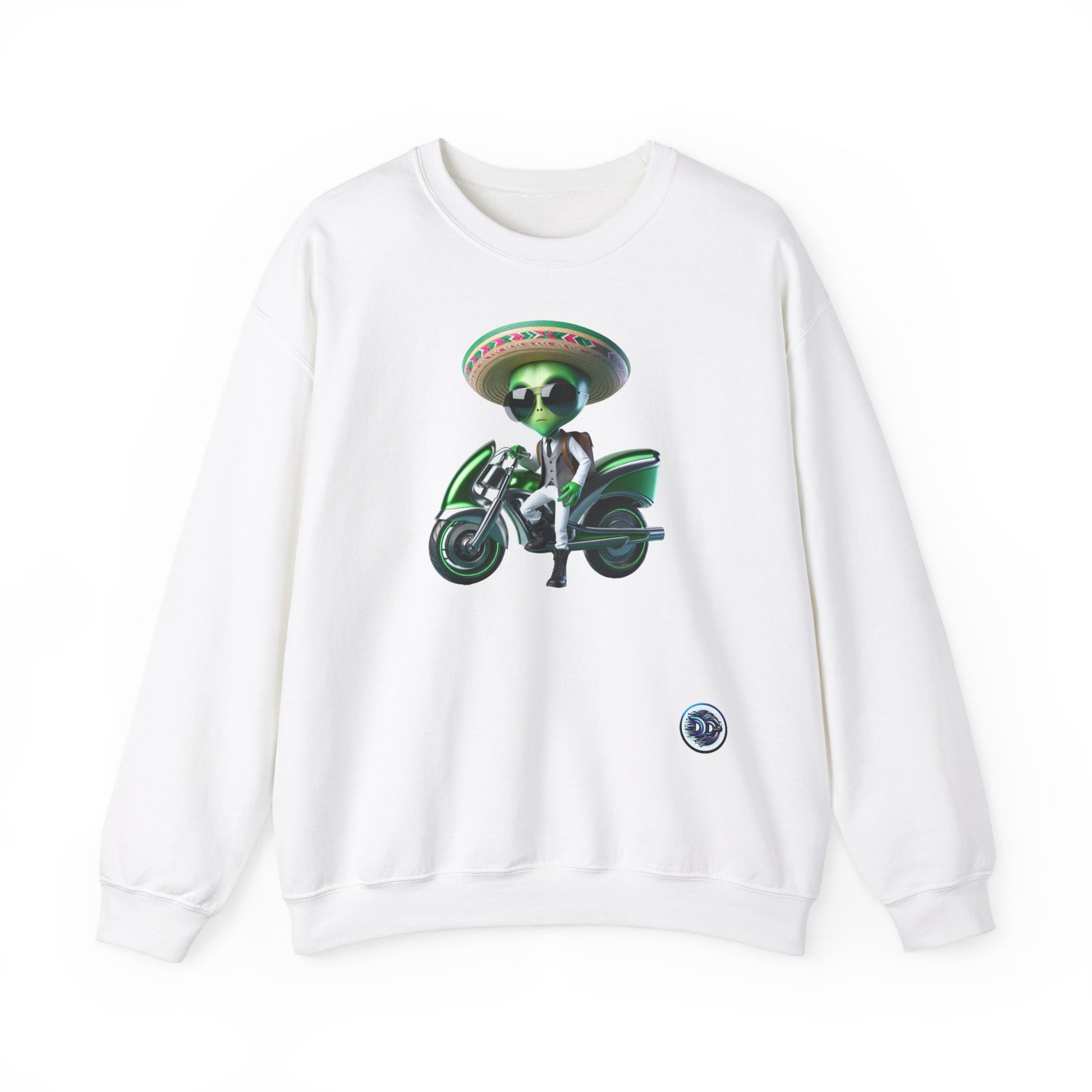 Introducing our one-of-a-kind crewneck featuring a random sci-fi green alien cartoon character, perfectly quirky in shades and a sombrero! Watch him confidently step off his futuristic motorcycle on this white design backdrop. This crewneck is a must-have for all space enthusiasts, adding an intergalactic touch to your wardrobe. #AlienFashion #SciFiStyle #CartoonVibes #FuturisticWear #UniqueApparel #ExtraterrestrialChic #FashionForward #StatementPiece #Crewneck #SpaceStyle