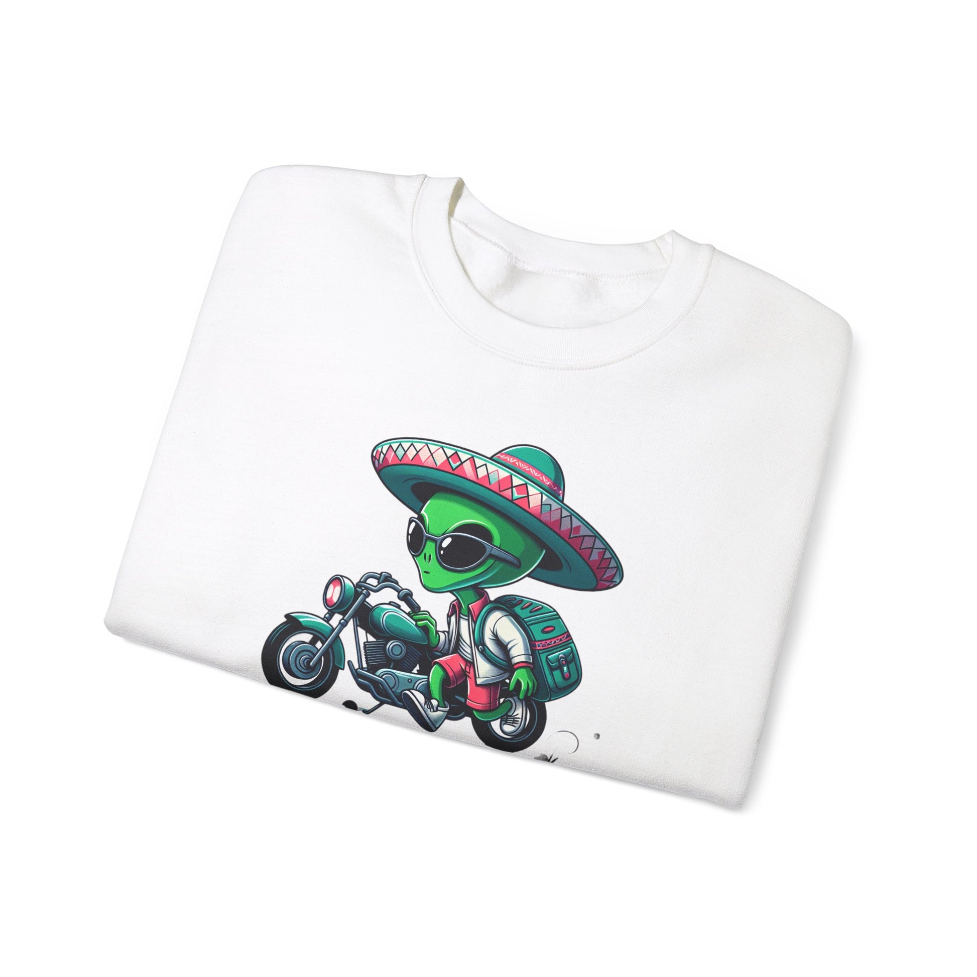 Introducing our exclusive crewneck featuring a groovy green alien sporting shades and a sombrero, casually stepping off his sleek futuristic motorcycle! The design stands out with a white background of abstract patterns that elevate this otherworldly piece. Embrace space fashion with this unique look! πΈπ« #AlienFashion #SciFiChic #ExtraterrestrialStyle #GalacticGear #SpaceTrend #AlienVibes #FuturisticFashion #CoolAlien #UniqueLook #CrewneckStyle