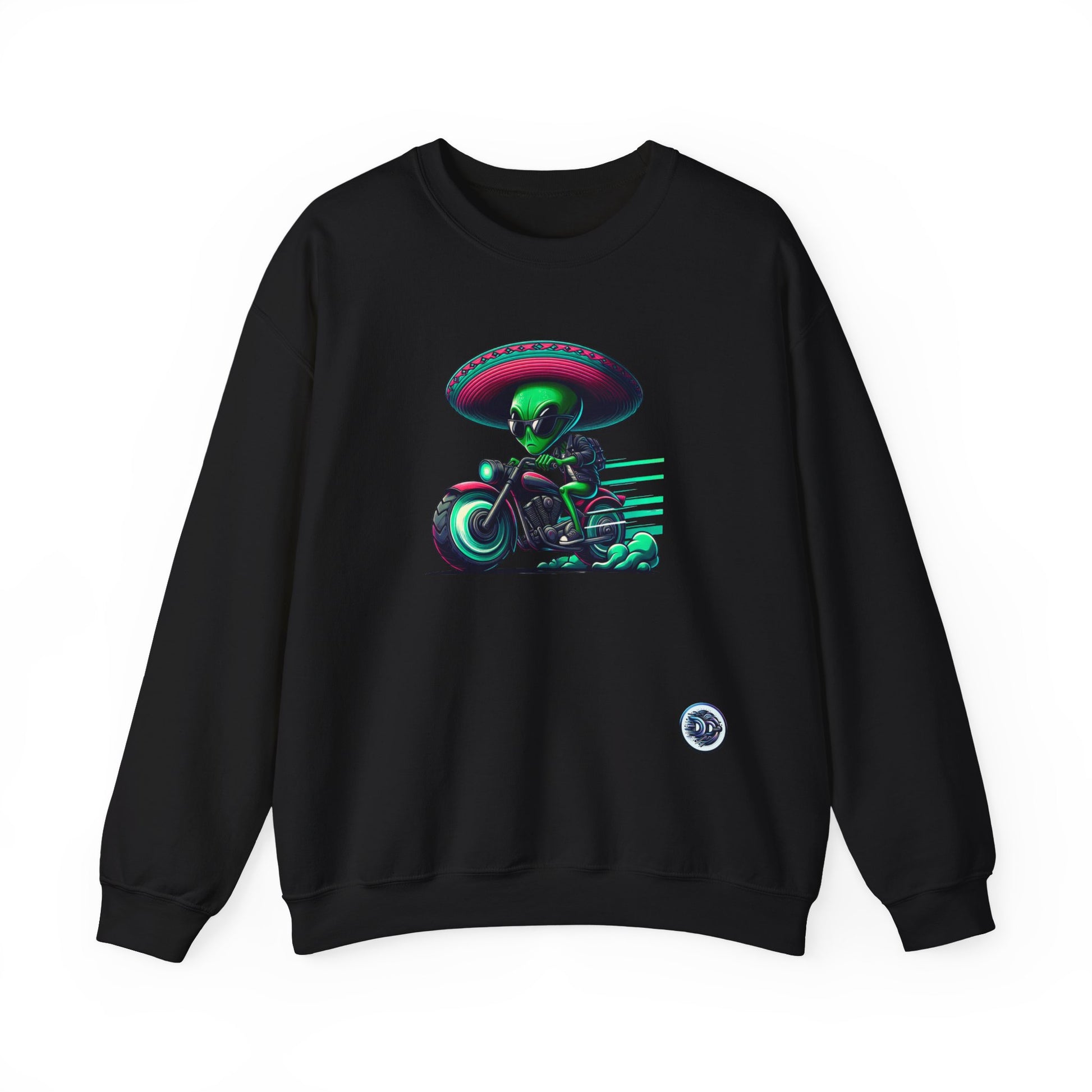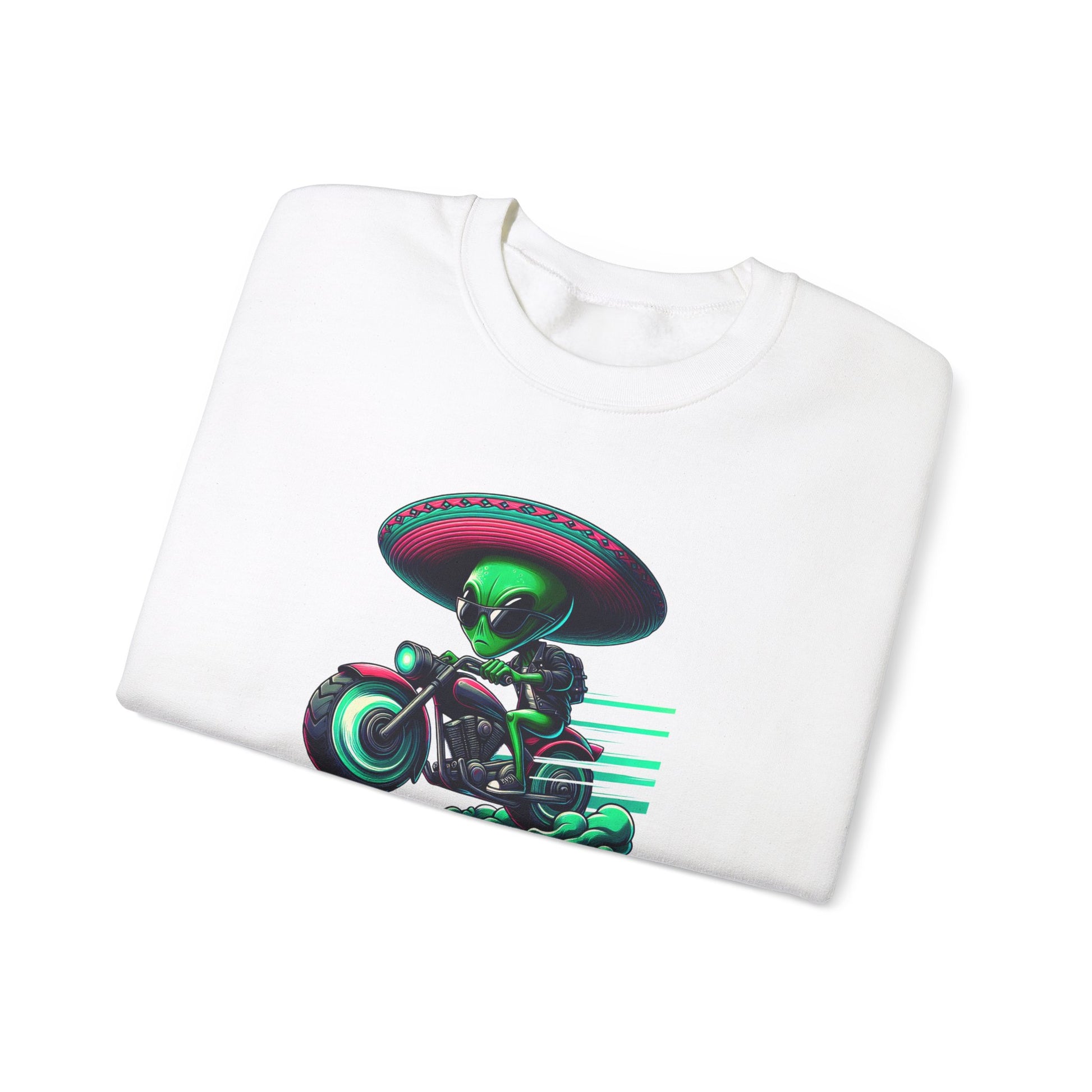 Introducing our out-of-this-world crewneck featuring a cool sci-fi green alien cartoon character rocking shades and a sombrero! Watch as he steps off his futuristic motorcycle into the spotlight. This unique design is a must-have for sci-fi fans and fashion enthusiasts alike. Embrace the fun and futuristic vibe with this one-of-a-kind crewneck. #SciFiFashion #AlienStyle #FuturisticLook #CoolCrewneck #CartoonCharacter #AlienFashion #UniqueDesign #FashionStatement #ExtraterrestrialChic #SpaceStyle