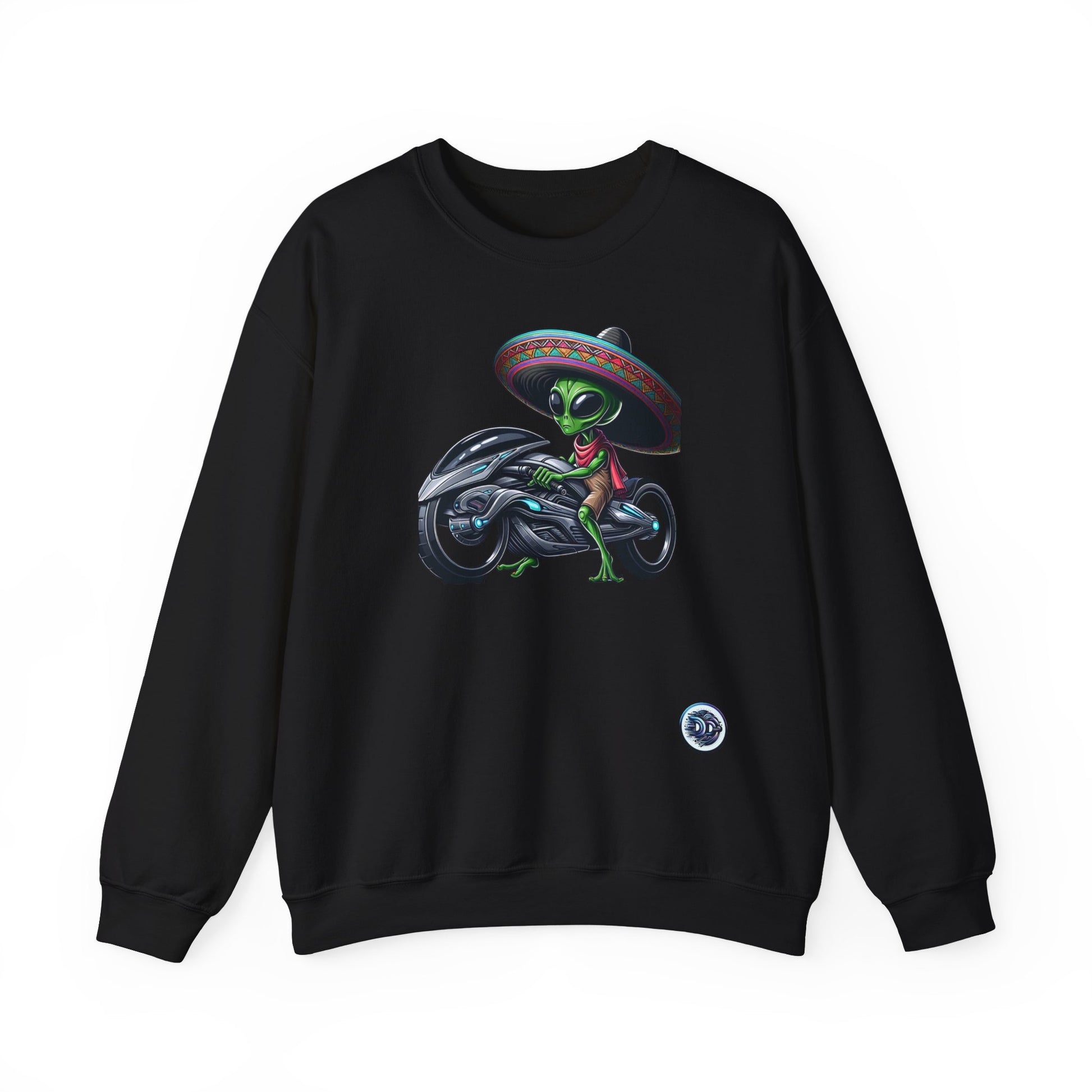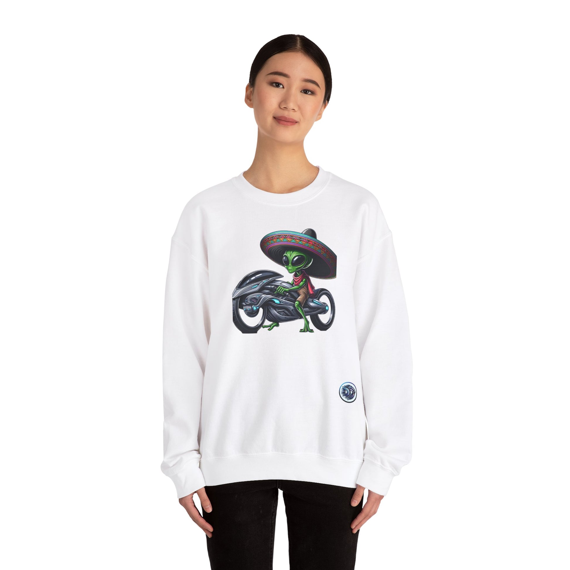 Dive into the intergalactic style with our trendy crewneck featuring a quirky green alien cartoon character donning shades and a sombrero. Watch him cruise on his futuristic motorcycle against a backdrop of stylish white designs. Embrace the cosmic coolness with this unique piece! #AlienFashion #SciFiStyle #ExtraterrestrialChic #FuturisticFashion #CoolCrewneck #AlienInShades #SombreroStyle #IntergalacticVibes #CartoonCharacter #OutofthisWorldFashion