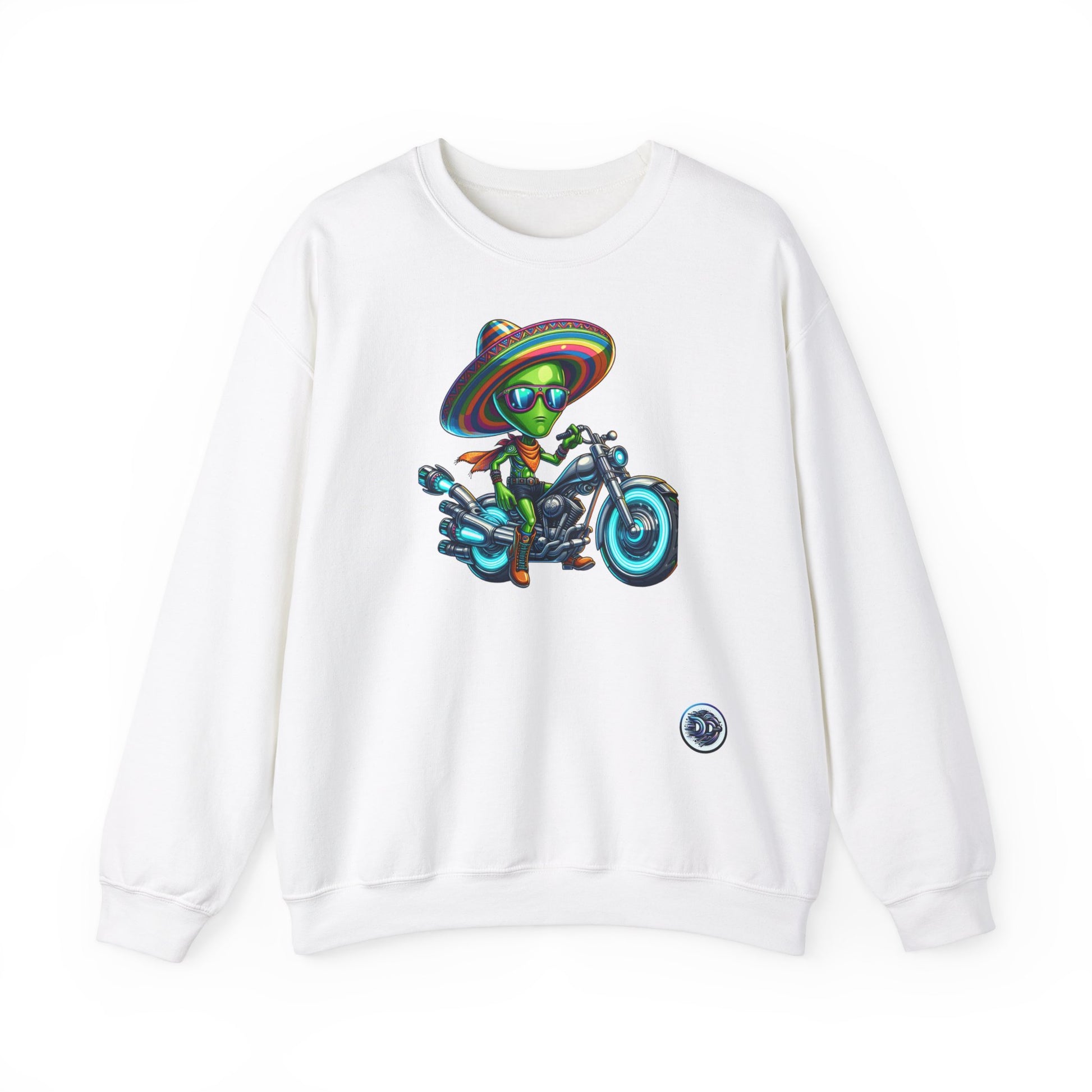 "Introducing our ultra-cool Crewneck featuring a playful sci-fi green alien cartoon character! Watch as he confidently steps off his sleek futuristic motorcycle, shades and sombrero adding a touch of style. This crewneck is perfect for those who love quirky and unique designs. Let this alien adventure bring a pop of fun to your wardrobe! #AlienFashion #SciFiStyle #CoolCrewneck #FuturisticVibes #UniqueDesigns #CartoonCharacterApparel #PopOfFun #FashionForward #AlienAdventure #StatementSweater"