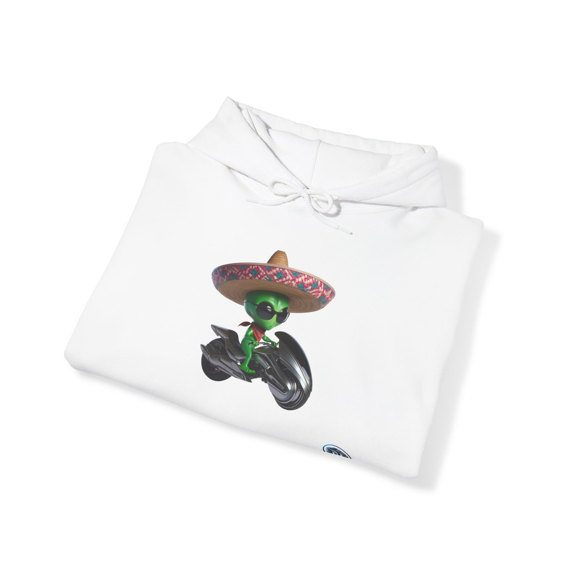 Introducing the Space Explorer Hoodie! Gear up like a cool sci-fi green alien, feeling out-of-this-world chic in shades and a sombrero, as he steps off his futuristic motorcycle onto new adventures! Features a comfy fit and stylish design. #AlienFashion #SciFiStyle #CoolHoodie #FuturisticVibes #OuterspaceWear #GalacticChic #ExtraterrestrialFashion #SpaceExplorer #UniqueApparel #FashionForward 🚀👽🕶️🎩
