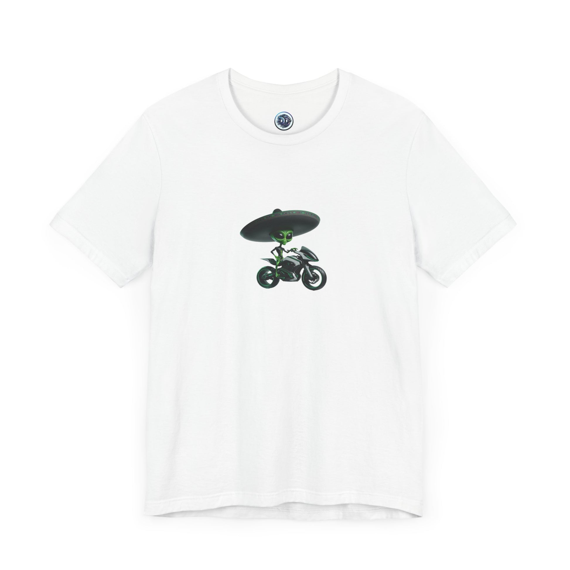 "Get ready to blast off in style with our Green Alien Cartel! This intergalactic tee features a futuristic green alien rocking cool shades and a sombrero, casually stepping off his high-tech motorcycle. Stand out in the crowd with this unique design on a crisp white background. Perfect for sci-fi enthusiasts and trendsetters alike! 🛸👽🌌 #AlienFashion #SciFiStyle #FuturisticTee #CoolShades #SombreroSquad #IntergalacticChic #SpaceVibes #UniqueDesign #Trendsetter #OutofthisWorld"