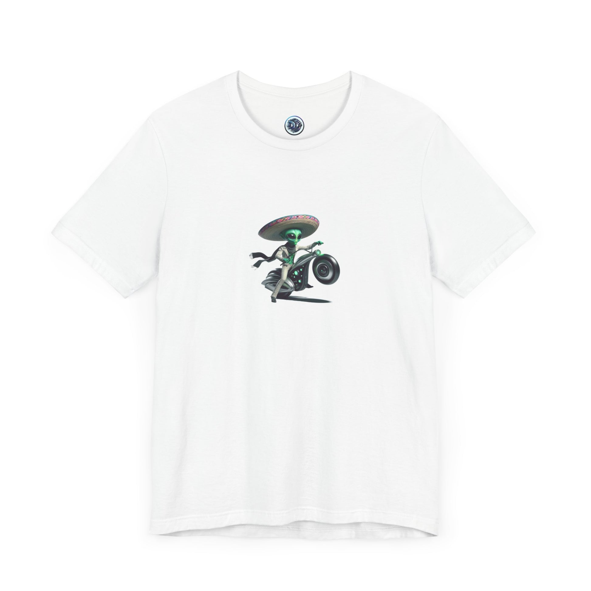 Introducing our out-of-this-world Green Alien Tee! This funky tee features a cool sci-fi green alien cartoon character rockin' shades and a sombrero 😎👽 Watch him step off his futuristic motorcycle in style against a white background with sleek designs. Get ready to turn heads with this unique tee! 🚀 #AlienFashion #SciFiStyle #ExtraterrestrialChic #FuturisticTee #CoolAlien #ShadesAndSombrero #SpaceFashion #CartoonCharacterTee #AlienInAction #OutofthisWorldClothing