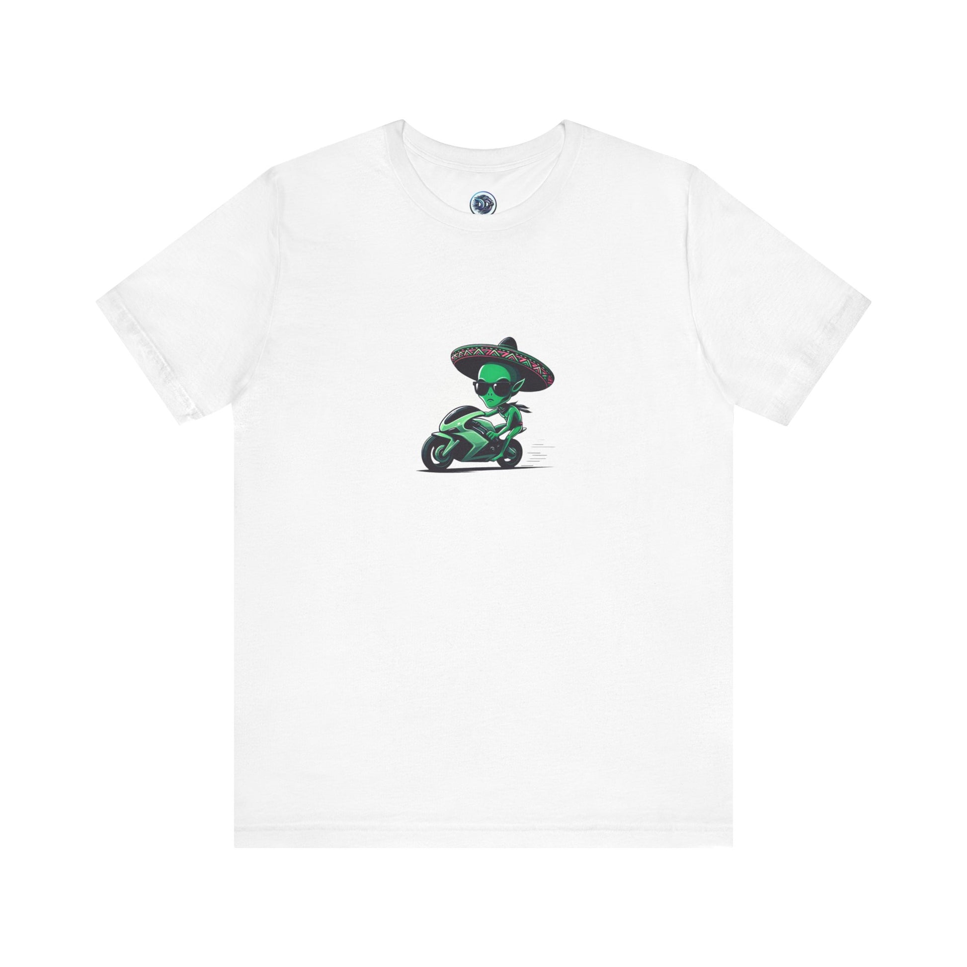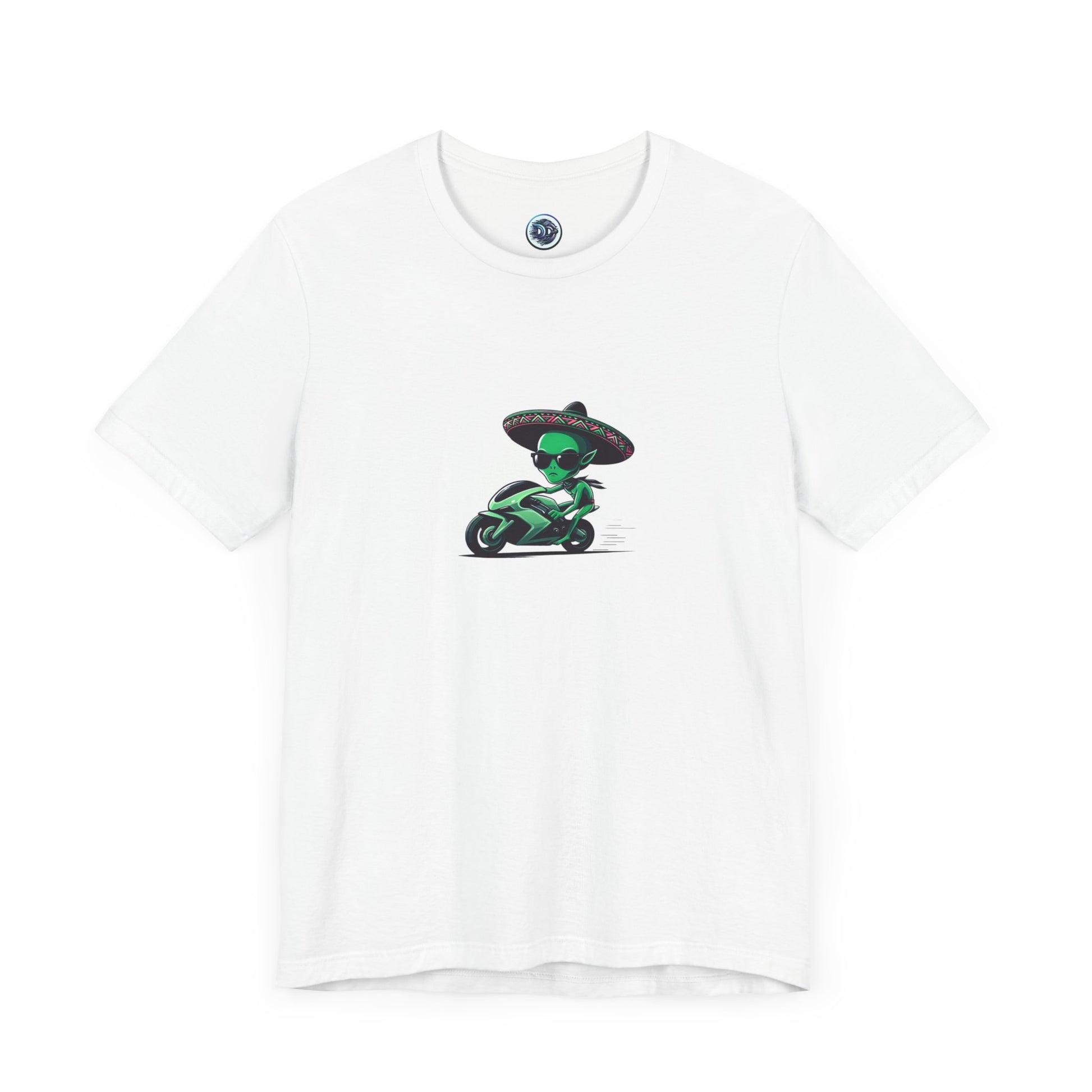 "Introducing our quirky Green Alien T-Shirt! This fun-loving sci-fi character is ready to hit the town in style, sporting cool shades and a stylish sombrero. Check him out as he confidently steps off his futuristic motorcycle. With a white backdrop featuring unique designs, this tee is perfect for sci-fi enthusiasts, trendsetters, and anyone who loves a dash of humor in their wardrobe. Get yours today and join the intergalactic fashion revolution! #AlienLife #SciFiStyle #FuturisticFashion #CoolAlien #CartoonCharacter #FunnyTShirt #GreenAlien #SombreroStyle #AlienFashion #TeeWithAttitude"