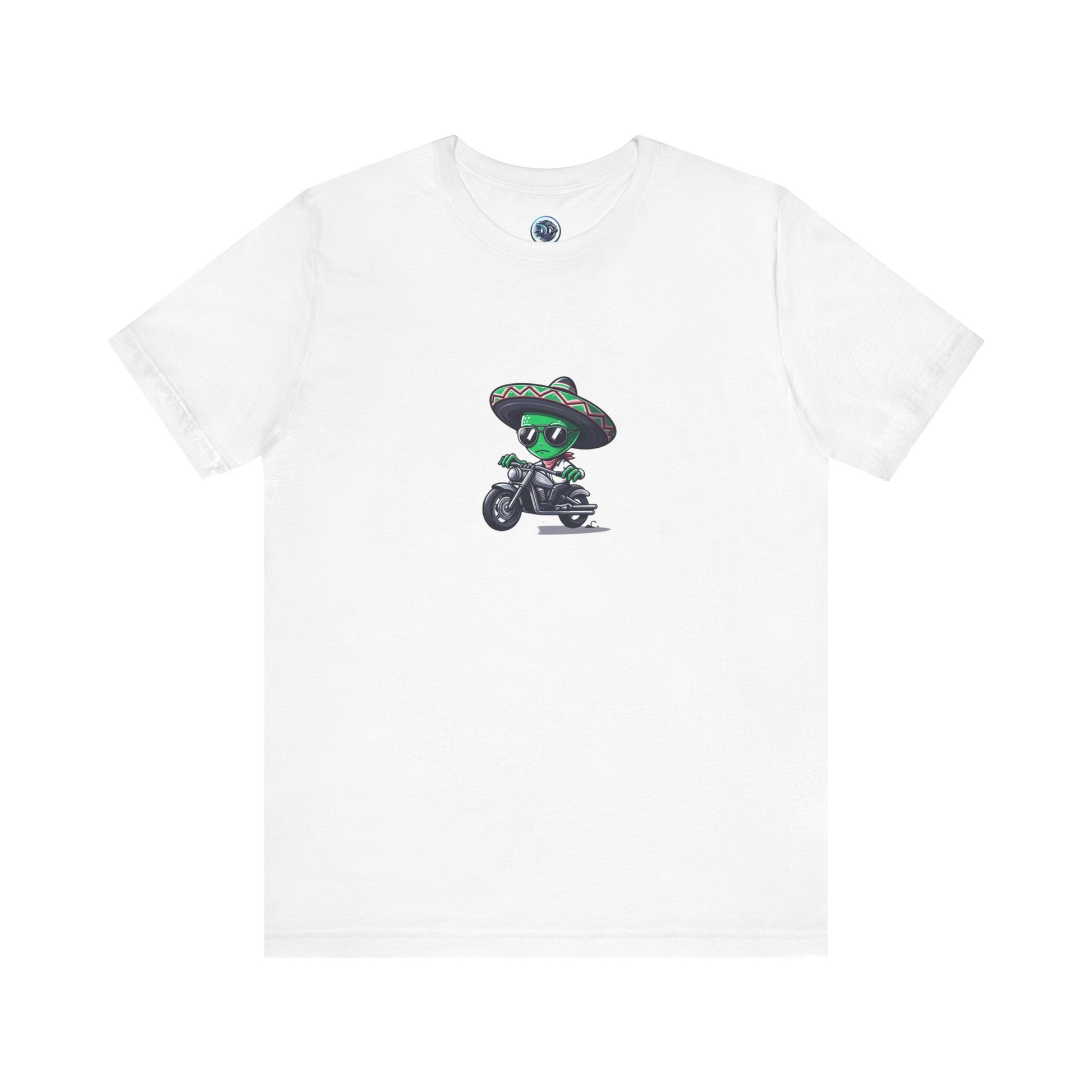 "Intergalactic cool just got a major upgrade with our Sci-fi Green Alien T-shirt! This quirky carton character is rocking shades, a sombrero, and stepping off his futuristic motorcycle. Join the out-of-this-world style statement now! #AlienFashion #SpaceStyle #CoolTee #FuturisticMotorcycle #SombreroChic #CartoonCharacter #GreenAlien #SciFiTrend #ExtraterrestrialVibes #FashionForward"