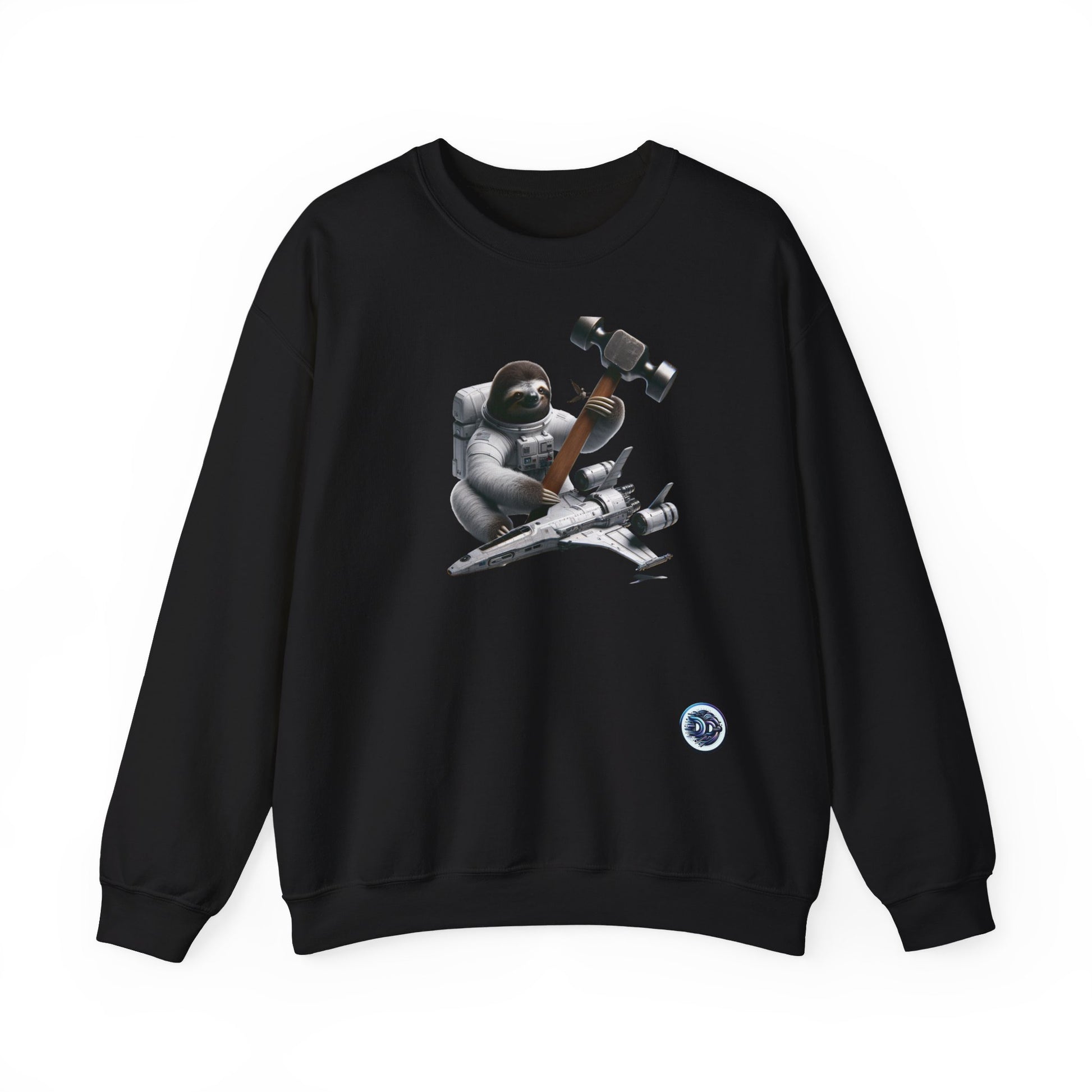 Introducing our exclusive Crewneck: Witness the whimsical sight of a space-faring sloth diligently repairing his high-tech spaceship with a comically oversized hammer. A blend of determination and relaxation defines this unique scene, capturing the essence of unexpected charm. Pure white background highlights every finely rendered detail, making this design truly out-of-this-world. Elevate your style with a touch of cosmic humor!