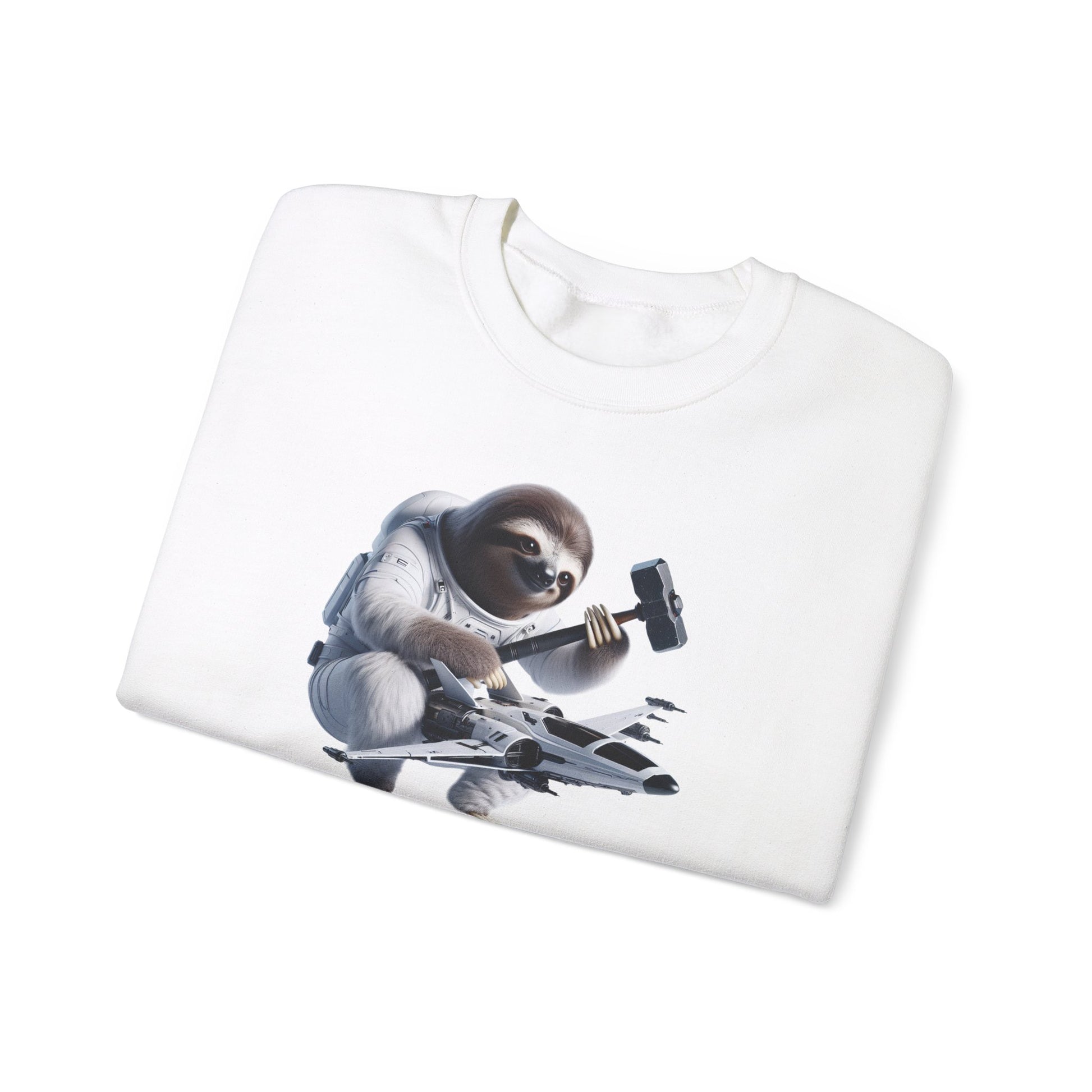 Introducing our Crewneck featuring a quirky scene of a futuristic sloth fixing his spaceship with an oversized hammer. Watch as this determined yet laid-back sloth tackles repairs in space effortlessly. The sleek, high-tech spaceship design complements the humorous touch of the giant hammer perfectly. Let this design add a dash of humor and adventure to your wardrobe. #slothinspace #futuristicsloth #spaceshiprepair #humorousdesign #highquality #crewneck #unisexstyle #uniqueapparel #fashionstatement #spaceadventure 🚀🛠️🌌