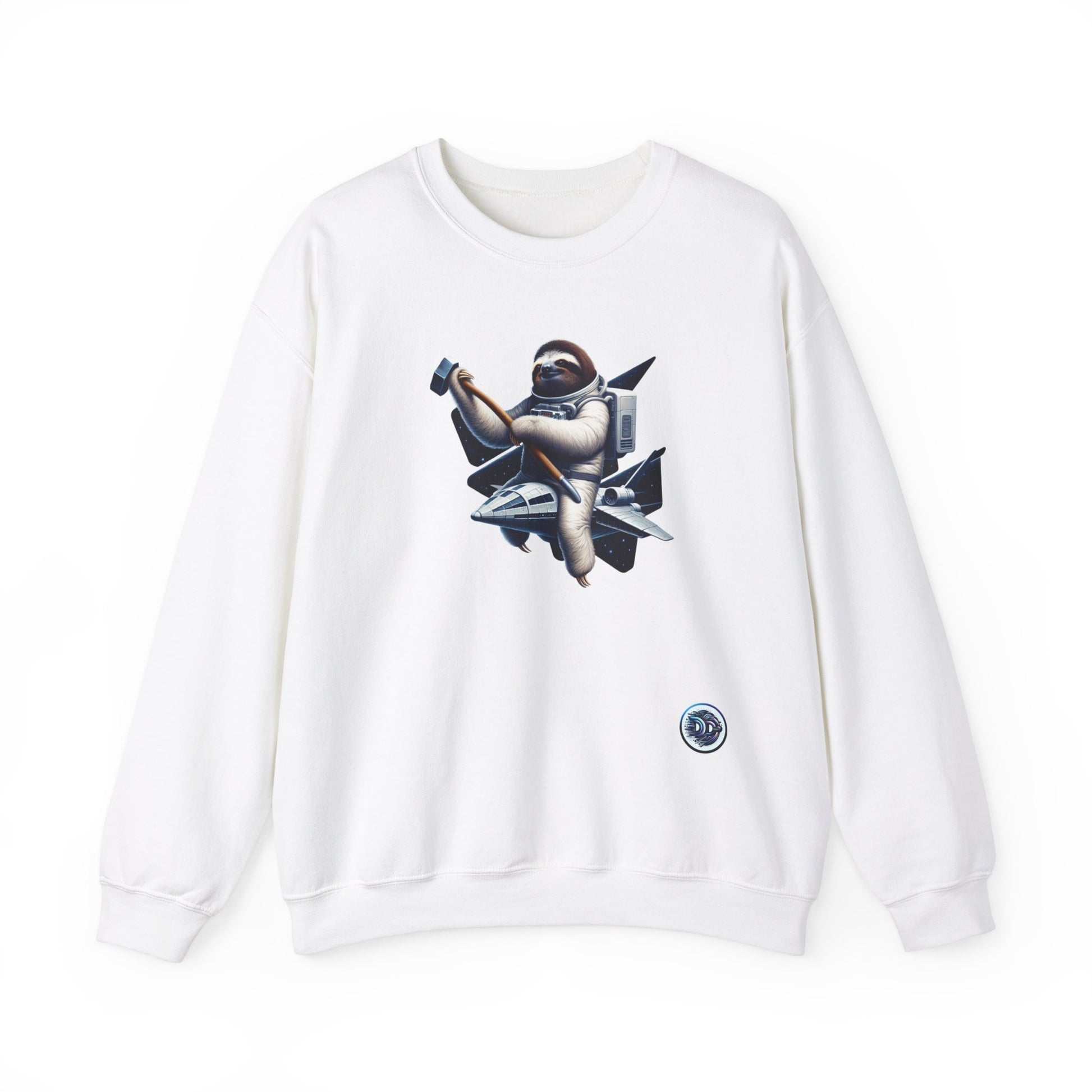 Introducing our crewneck: a space-bound sloth in a futuristic voyage. Witness the determined sloth, fixing his sleek spaceship with an unusually large hammer. The juxtaposition of high-tech designs and humorous elements creates a unique charm. Get ready to embark on an interstellar adventure in style!