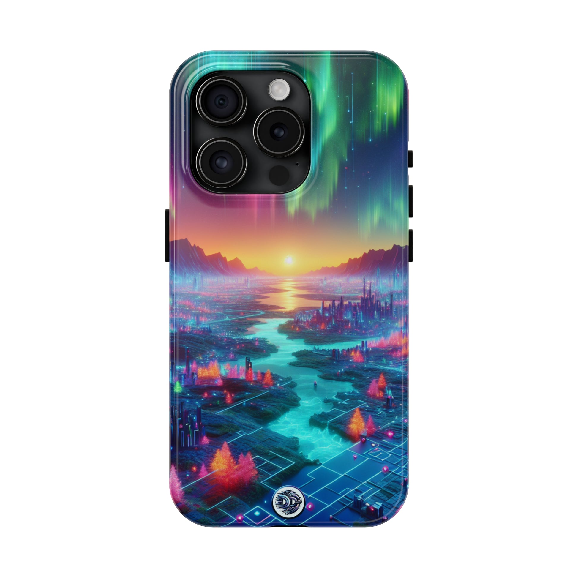 Unveil the harmony of a cyberpunk civilization with our Digital Landscape Phone Case. Vibrant neon-colored flora, scattered futuristic tech, glowing bodies of water, and sky adorned with auroras unleash an exotic blend of nature and advance. No grids, no buildings- pure, fluid #Cyberpunk #DigitalLandscape #PhoneCase #TechNature #FuturisticDesign #NeonColors #AdvancedCivilization #AuroraSky #GlowingRivers #NoGrids #VibrantAccessories.