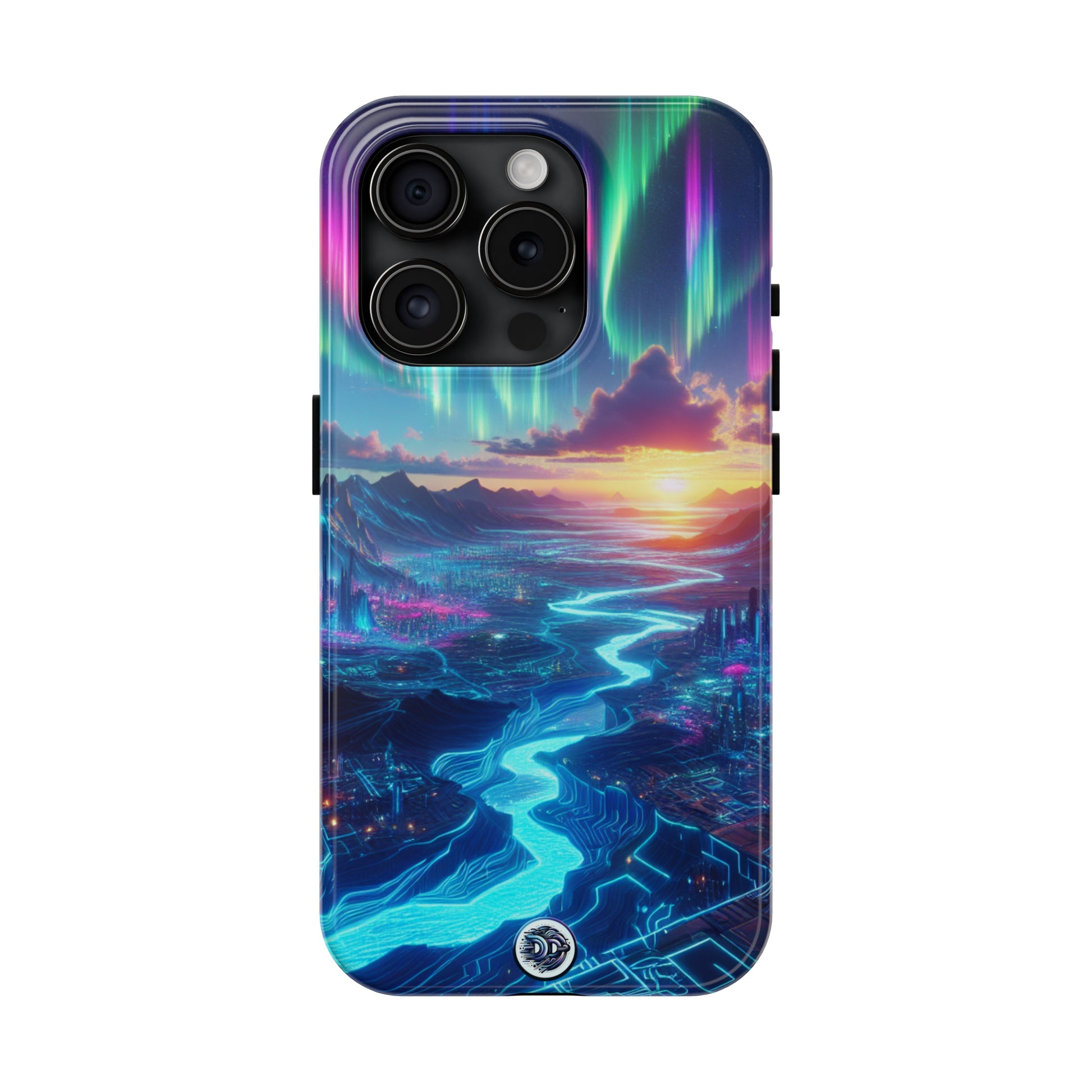 Dive into an otherworldly reality with our Cyberpunk Landscape Phone Case! Watch as vibrant neon flora and advanced tech elements harmonize in an open field, uninhibited by digital blue squares or grids. Glowing rivers wind through the scene, under an aurora-lit sky, symbolizing a tech-nature blend in a futuristic world. #PhoneCase #Cyberpunk #VibrantColors #Futuristic #Technology #NeonFlora #GlowingRivers #Auroras #TechNatureHarmony #AdvancedCivilization.