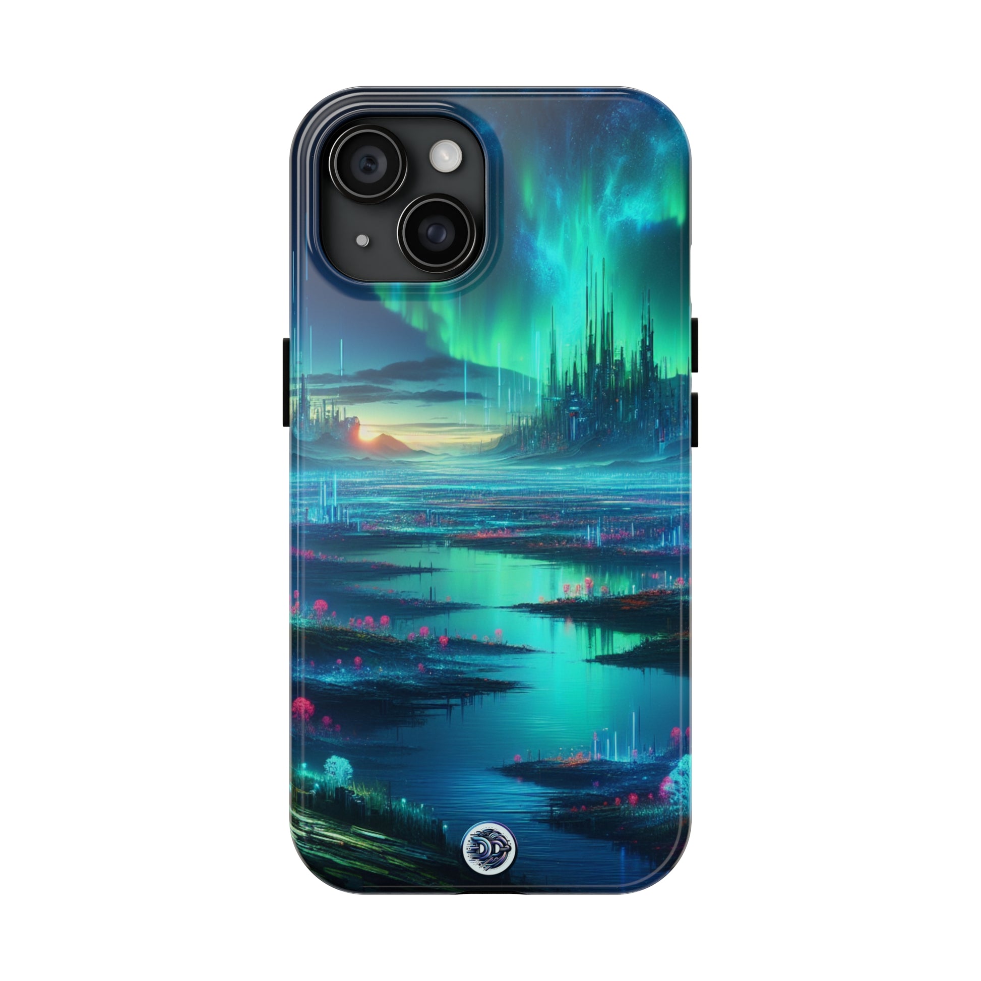 Discover a new realm with our Cyberpunk-Themed Phone Case. Its design showcases a dazzling digital landscape, combining futuristic tech and neon flora seamlessly. Immersive aurora-lit skies and glowing water bodies highlight the harmony between nature and advances. No urban constraints, no digital grids, just free space and fluid designs. Feel at harmony with the future. #PhoneCase #Cyberpunk #Technology #Nature #Futuristic #Neon #Aurora #OpenSpace #DigitalArt #DesignElegance