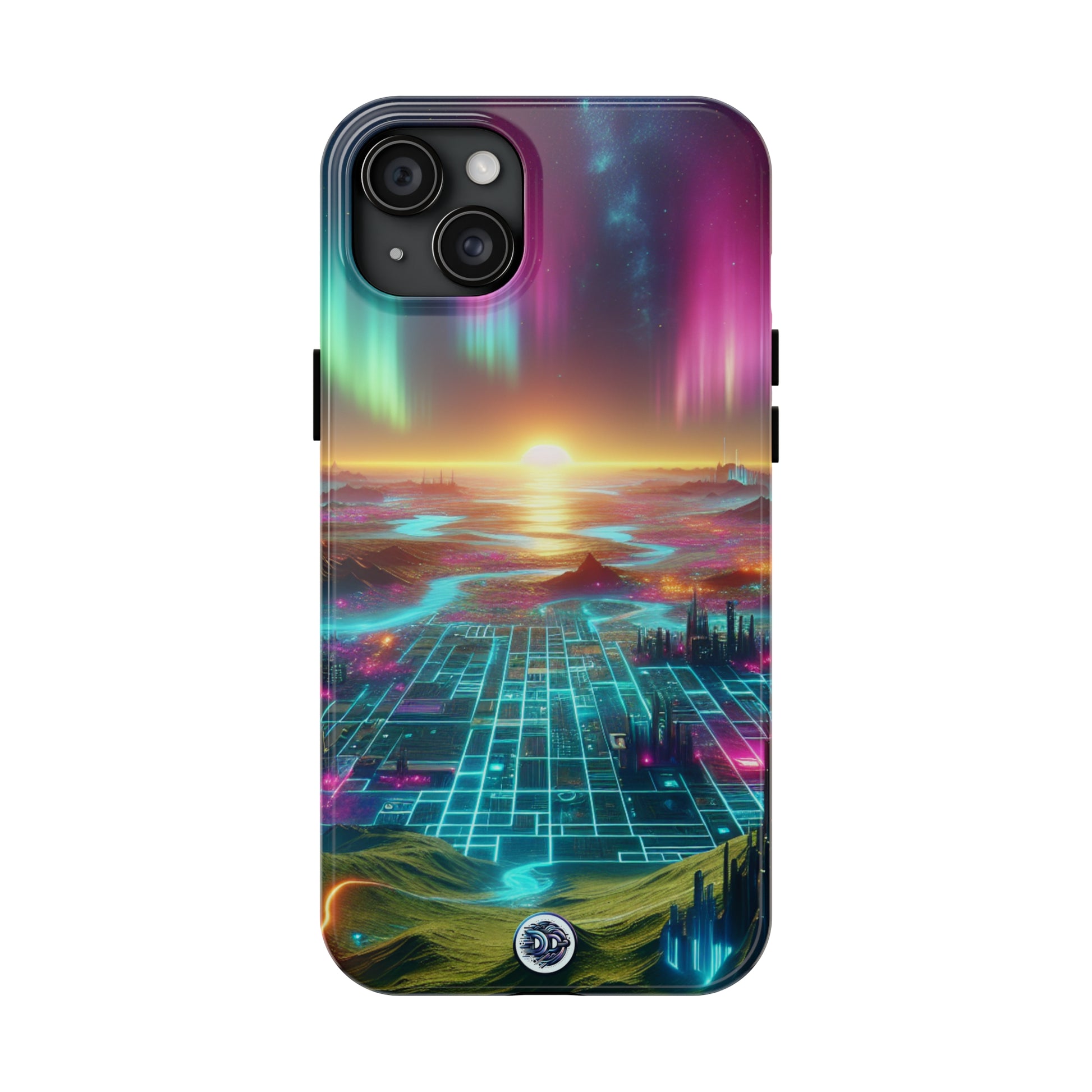 #CyberpunkStyle #DigitalLandscape #NeonColors #FuturisticTech #AdvancedCivilization #HarmonyWithNature #PhoneCase #GlowingRivers #NatureAuroras #OrganicDesigns