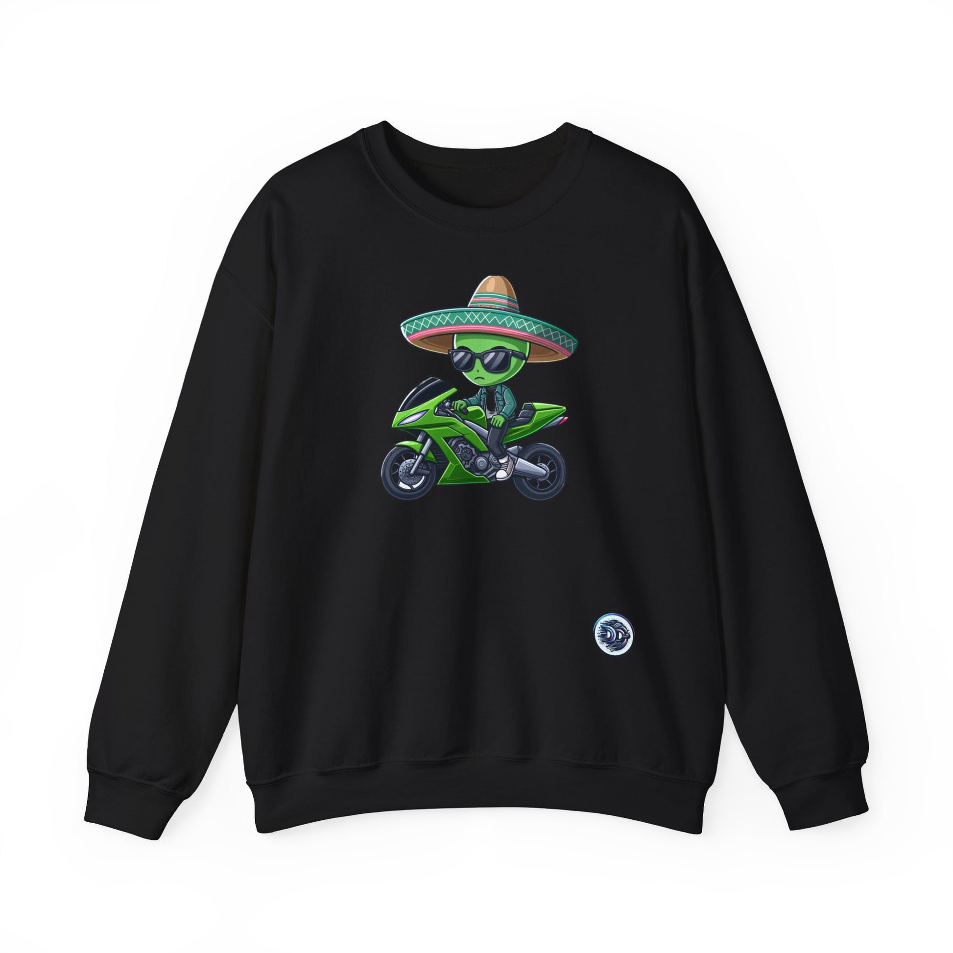 Introducing our out-of-this-world crewneck featuring a stylish green alien sporting shades and a sombrero! Watch him zip off on his futuristic motorcycle in jaw-dropping style. This comfy crewneck is perfect for sci-fi lovers! #AlienFashion #FuturisticStyle #GreenAlien #SciFiFan #Crewneck #AlienGear #SombreroStyle #CoolAlien #FashionForward #RadicalAlien
