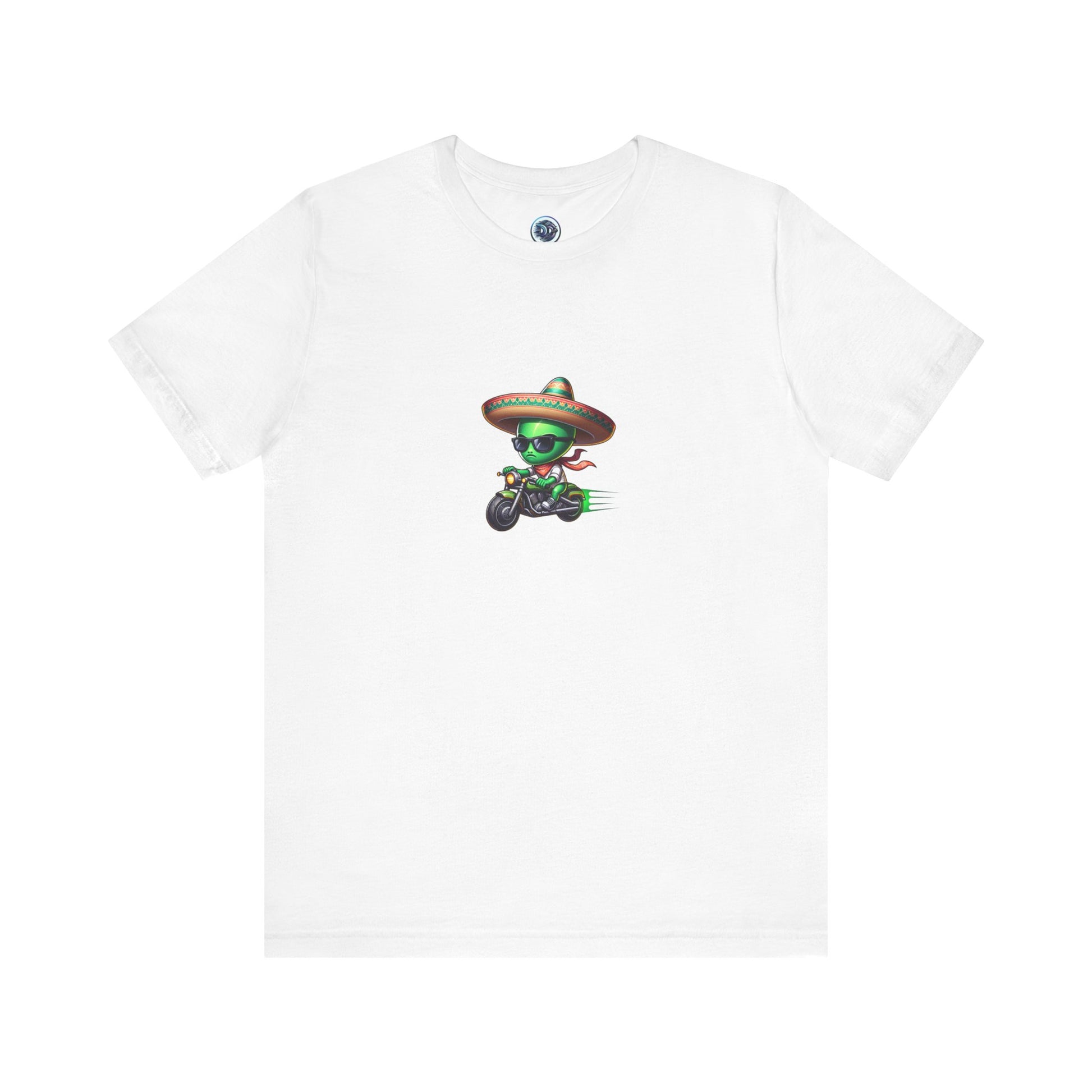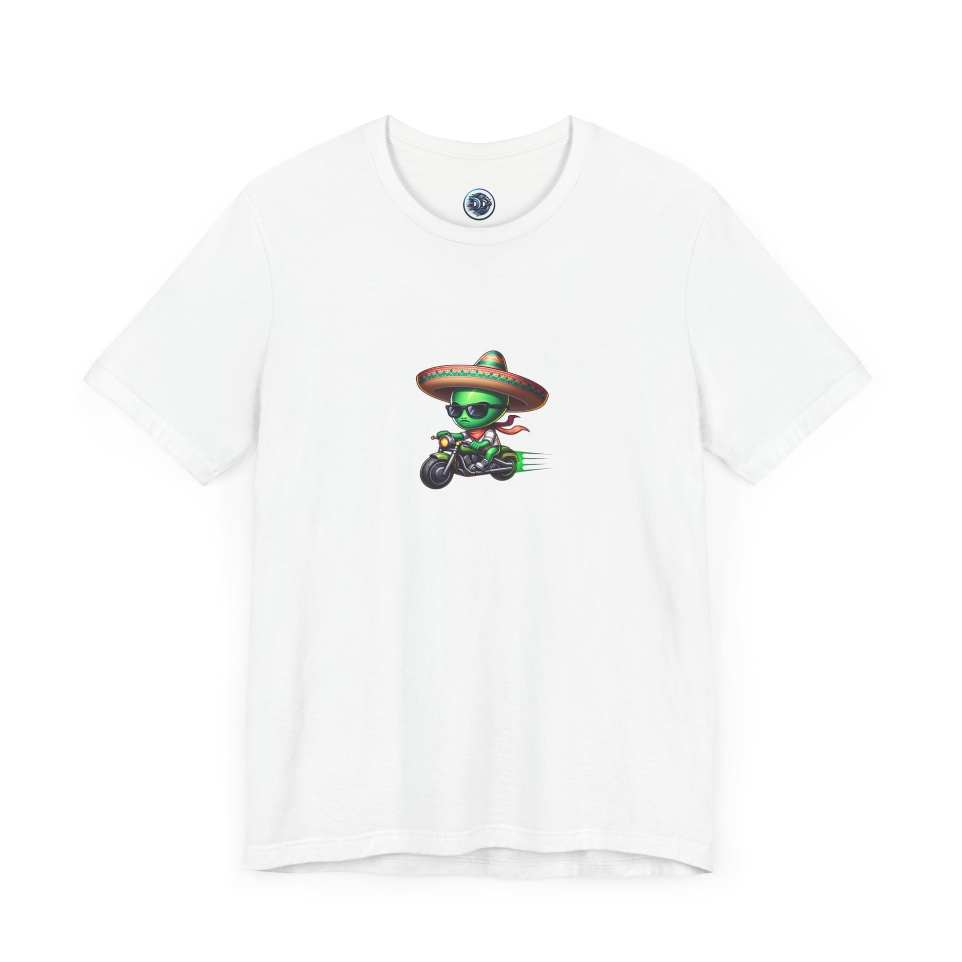 Step into the future with our quirky sci-fi green alien t-shirt! This fun and out-of-this-world design features a cool cartoon character sporting shades, a sombrero, and cruising on a futuristic motorcycle. Let this playful design bring some intergalactic style to your wardrobe. #SciFiFashion #AlienChic #CartoonTee #CoolCharacter #FuturisticStyle #ExtraterrestrialVibes #FunShirt #UniqueDesign #OutofthisWorld #FunkyFashion