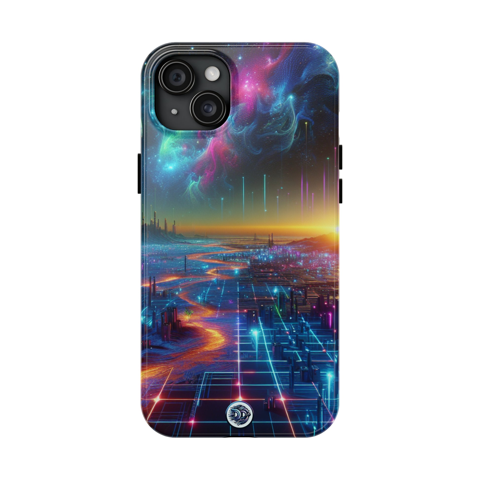 Elevate your device with our Cyberpunk Landscape Phone Case. Ensconced in vibrant colors, it pictures a vast space of neon-colored flora, futuristic tech, and luminescent water bodies beneath an aurora-lit sky. It encapsulates the unity of advanced civilization with nature. No digital blues, no grids, just organic, fluid vistas. #Cyberpunk #PhoneCase #Technology #Neon #Aurora #FuturisticTech #DigitalHarmony #NatureFusion #FluidDesigns #AdvancedCivilization.