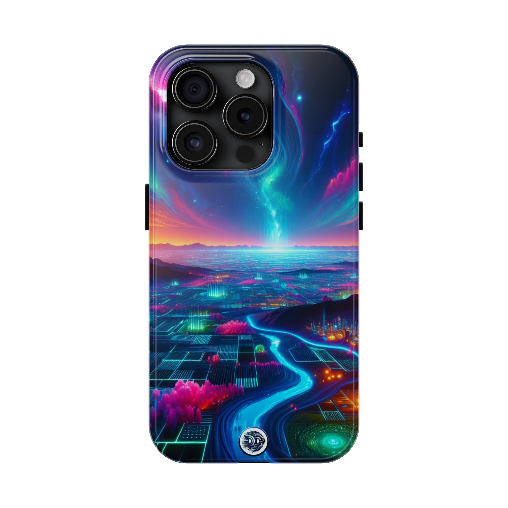 "Futuristic Cyberpunk Phone Case! Step into a vibrant, open, digital landscape devoid of typical blocky urban structures. Neon flora, tech remnants, and glowing aqua vistas paint a picture of advanced civilization in harmony with nature. Embrace the new-age organic designs that blend tech with the natural world. #CyberpunkCase #NeonFlora #FuturisticTech #GlowingRivers #AuroraSky #AdvancedCivilization #NatureHarmony #DigitalLandscape #VibrantPhoneCase #TechNatureBlend"