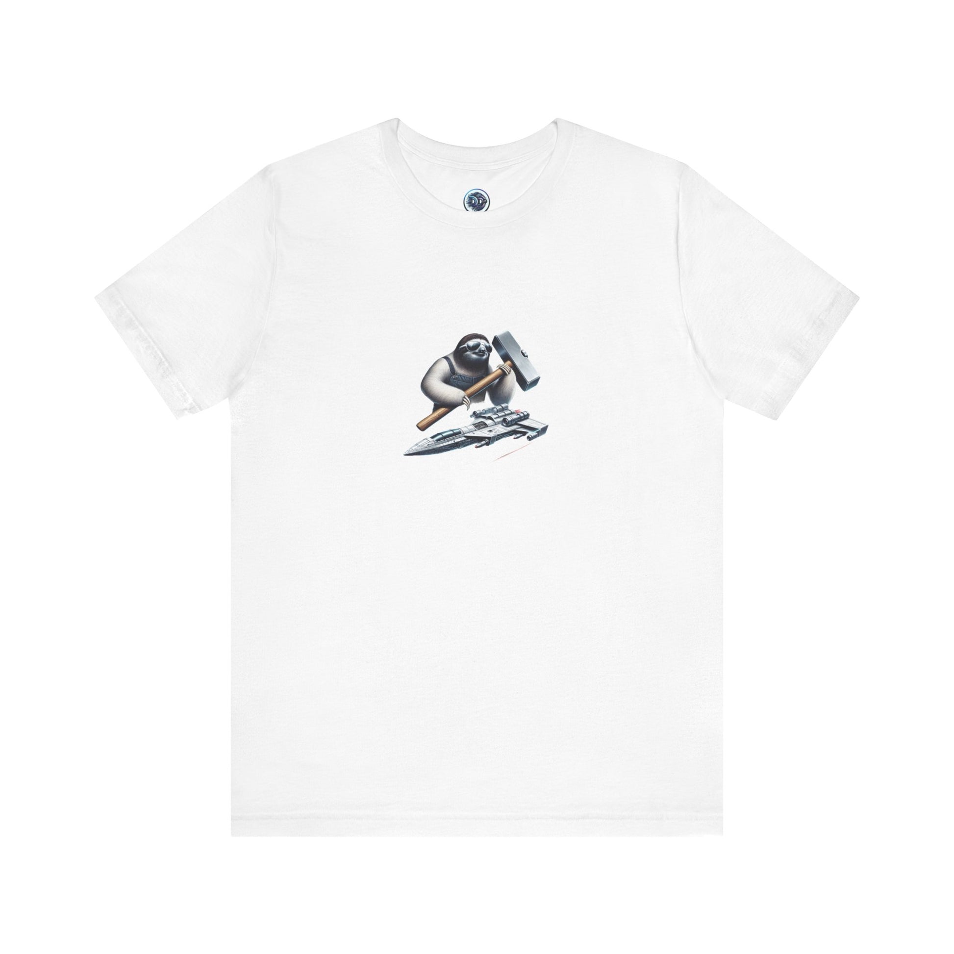 Introducing our out-of-this-world "Spacebound Sloth" t-shirt! This design showcases a futuristic sloth fixing his spaceship with a comically oversized hammer. The sloth exudes determination and relaxation as the sleek, high-tech spaceship gleams in the background. Let this quirky yet captivating design take you on a unique interstellar adventure. #SlothInSpace #FuturisticFashion #HumorousTee #GalacticStyle #SpaceSloth #UniqueDesign #QuirkyClothing #HighTechHumor #SpaceApparel #AdventureAwaits
