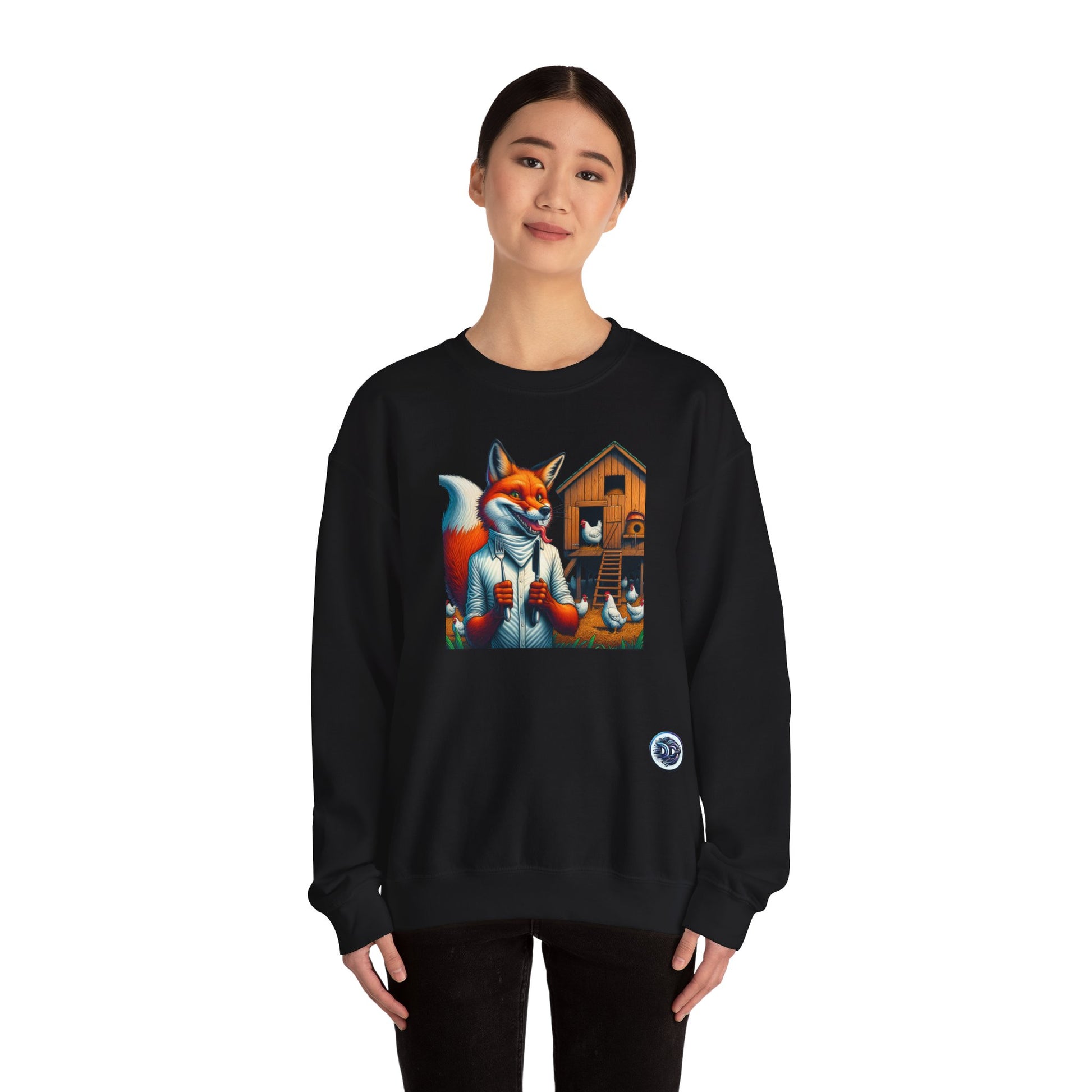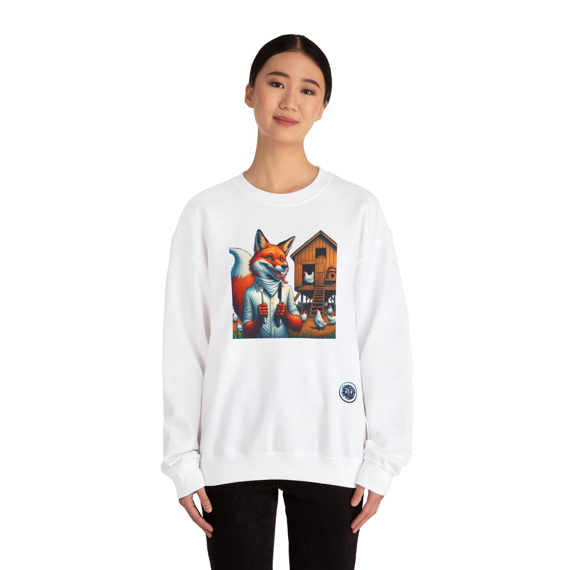 Introducing our cozy crewneck sweater that showcases a mischievous twist on the classic red fox theme. A delightful red fox, dressed to dine, takes center stage in a whimsical hen house setting. Ideal for those who appreciate playful designs with a touch of humor. #Crewneck #Sweater #RedFox #HenHouse #NapkinAndFork #WhimsicalFashion #CozyStyle #AnimalPrint #FoxFashion #OnlineShopping.
