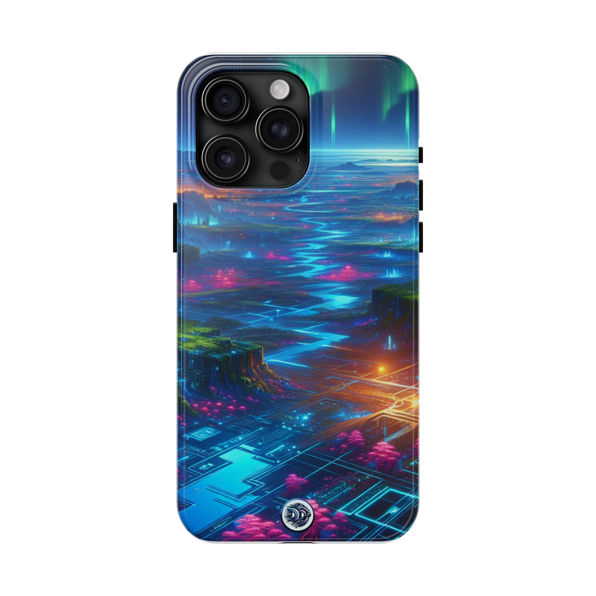 Experience the fusion of advanced tech and nature with our Cyberpunk Digital Landscape phone case. Set in a vast expanse, it boasts vibrant neon flora and luminous waterways amidst scattered futuristic tech, under a sky aglow with radiant auroras. Clear, sleek, and fluid design with no digital squares. #PhoneCase #Cyberpunk #NeonFlora #FuturisticTech #NatureTechHarmony #RadiantAurora #OpenSpace #AdvancedCivilization #GlowingRivers #AestheticPhoneCase