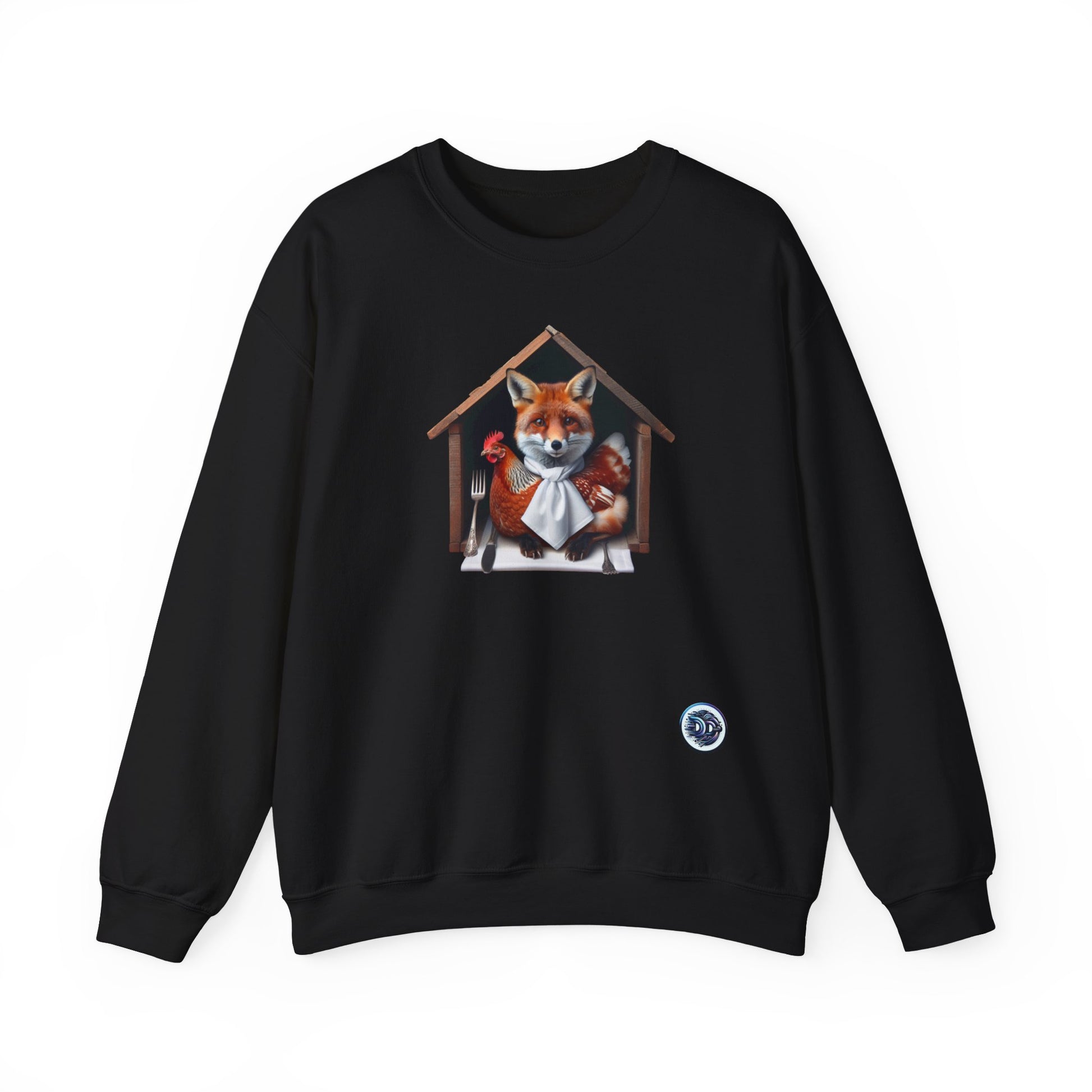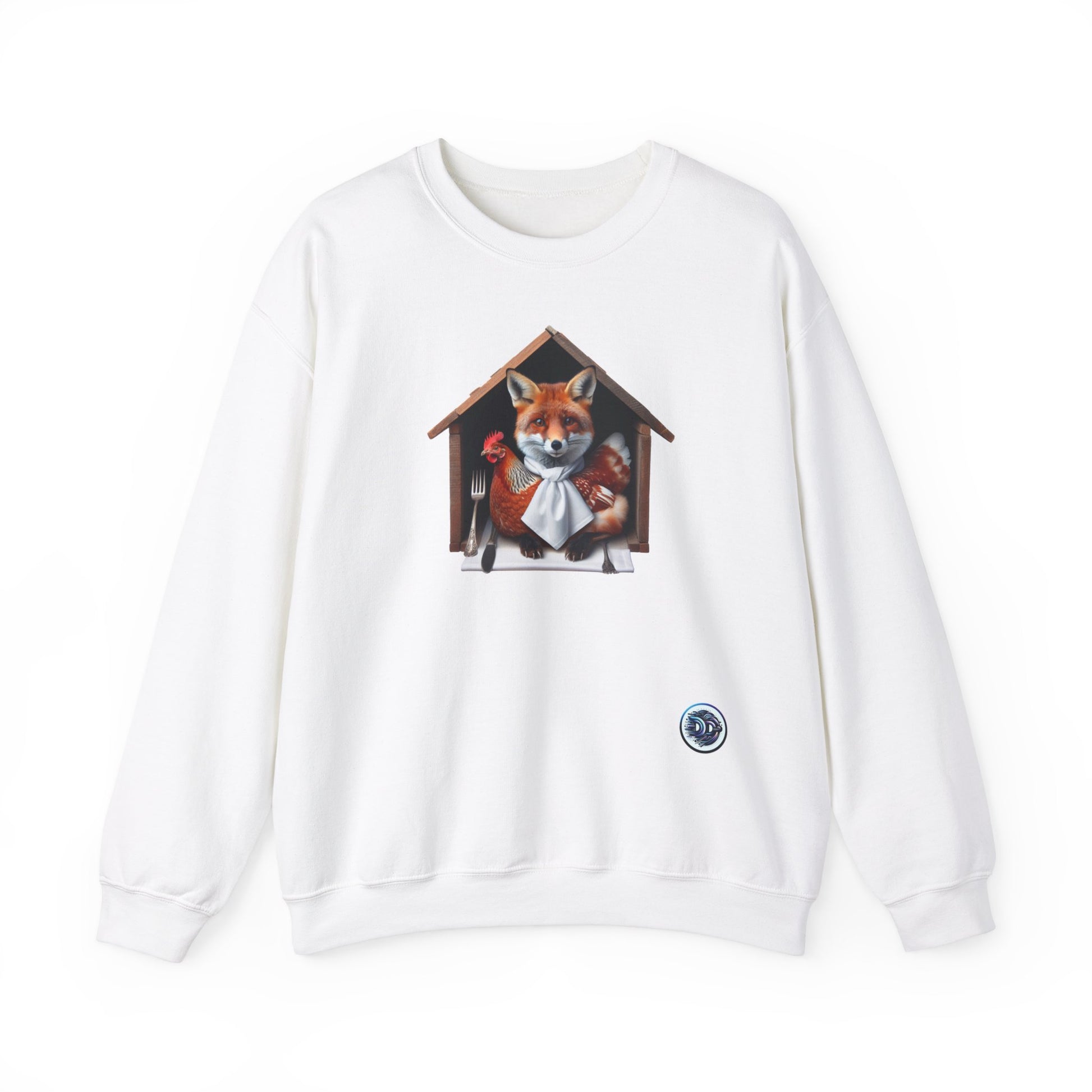 Introducing our cozy crewneck featuring a mischievous red fox in a hen house, complete with a napkin and utensils. Perfect blend of comfort and style. #Crewneck #RedFox #HenHouse #CozyStyle #AnimalPrint #KnifeAndFork #ComfyClothing #UniqueDesign #StatementPiece #EcoFriendlyFashion