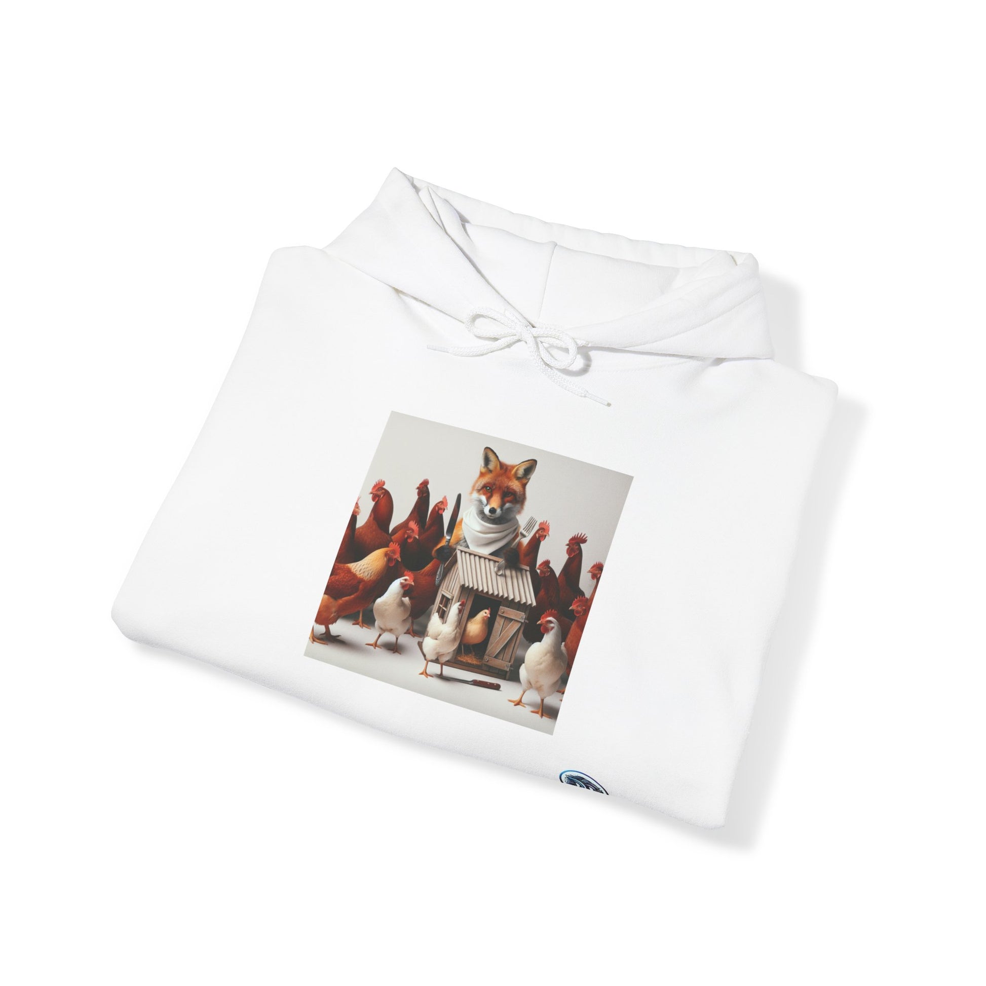 "Embrace your mischievous side in our Fox-In-The-Hen-House Hoodie. Featuring a bold red fox, complete with napkin, knife, and fork, set against a peaceful hen house backdrop. Perfect for those who are both playful and daring. #FoxFashion #AnimalInspired #HoodieStyle #UniqueDesign #FunnyApparel #StatementPiece #QuirkyFashion #GraphicHoodie #AnimalLovers #HoodieSeason"