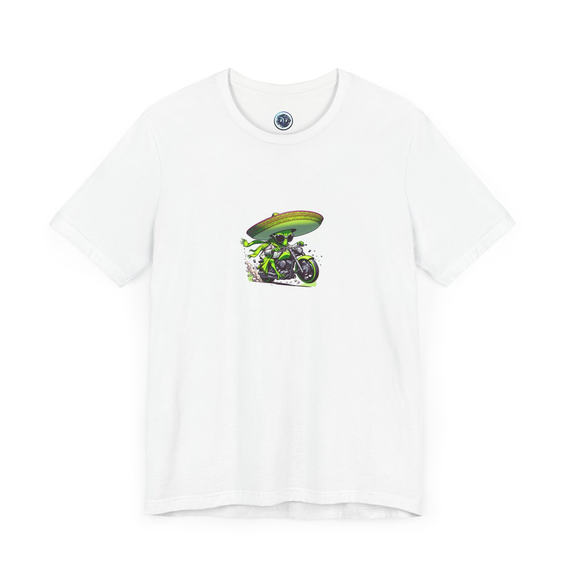 Introducing our Galactic Groove T-shirt! Step into style with this out-of-this-world design featuring a cool green alien sporting shades and a sombrero, casually stepping off his sleek futuristic motorcycle. The crisp white background adds a cosmic touch. Get ready to rock the universe in this eye-catching tee! #SciFiStyle #AlienFashion #ExtraterrestrialCool #SpaceSwag #FuturisticFashion #CoolTees #UniqueDesign #GalacticVibes #RockTheUniverse #TrendyTee