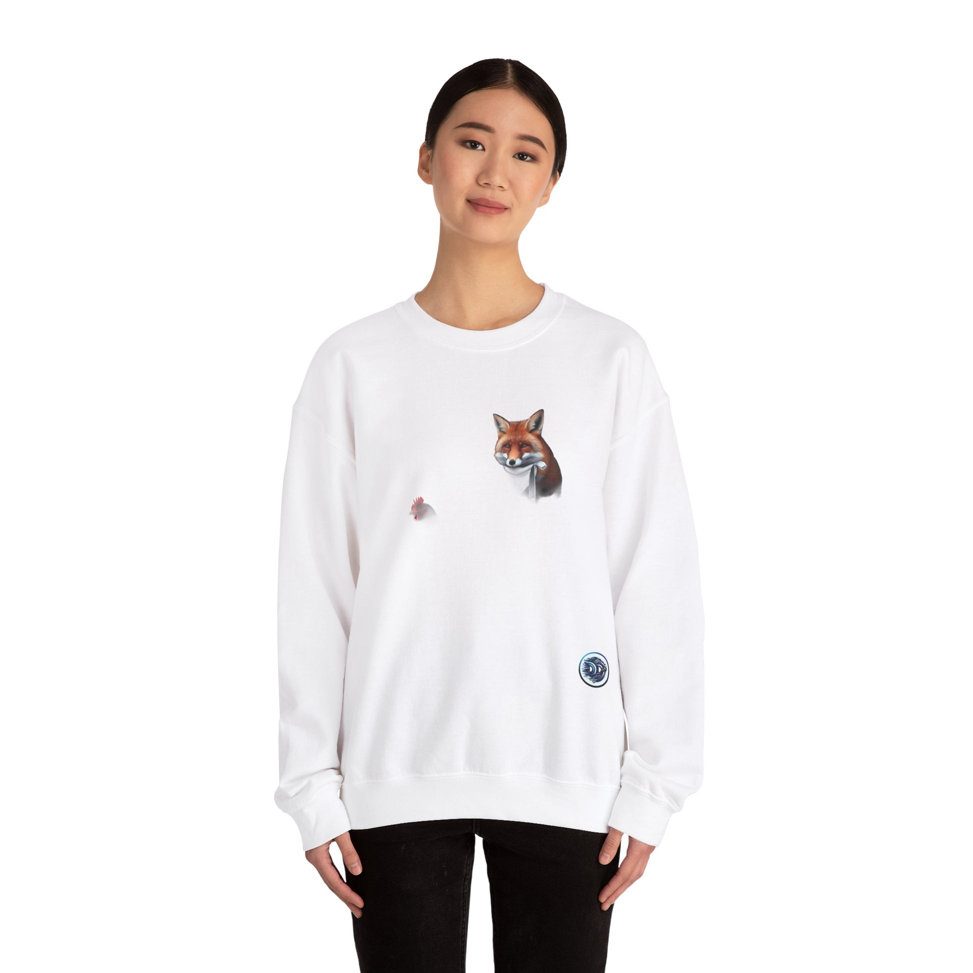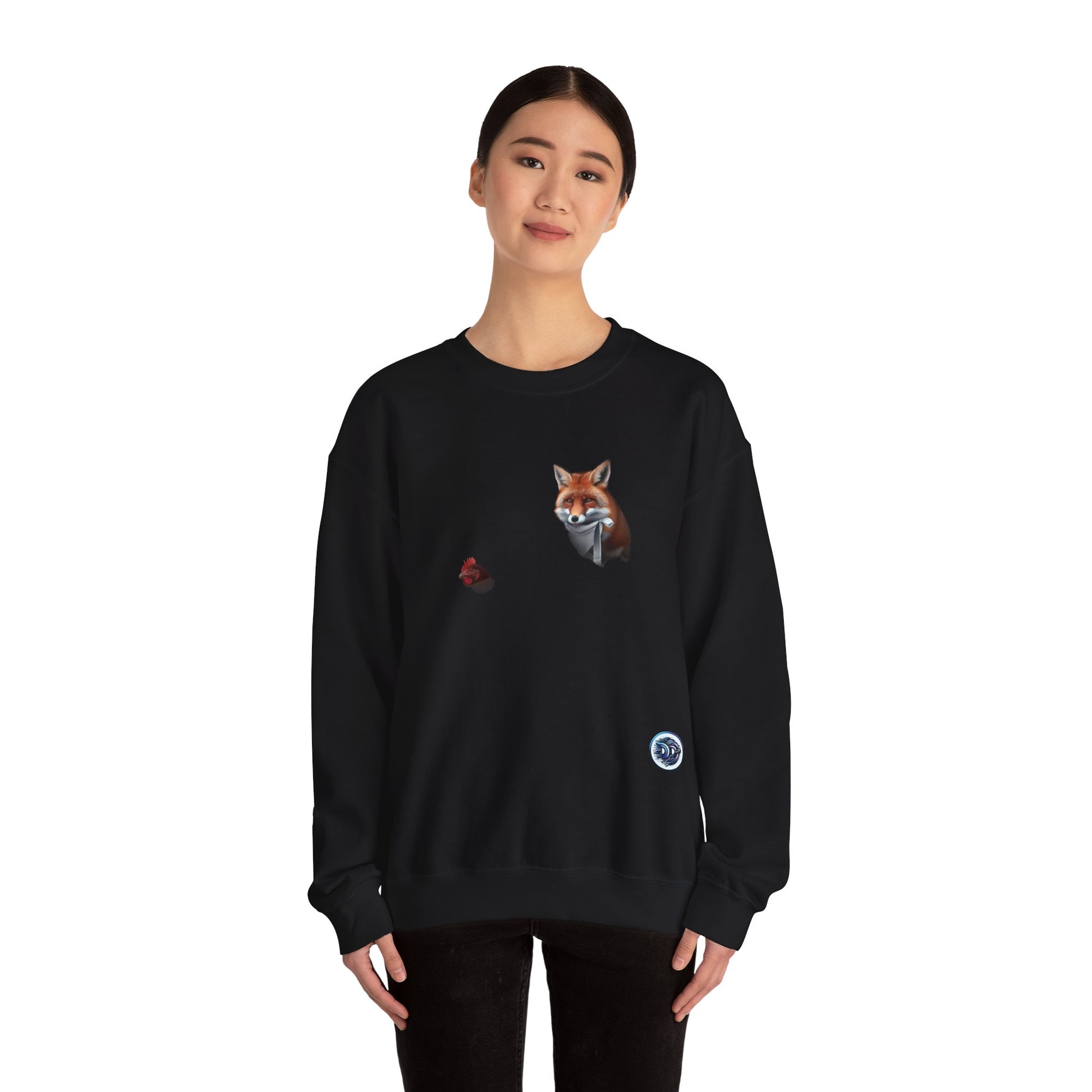 Unleash your wild side in this cozy crewneck featuring a mischievous red fox in a hen house, complete with a napkin, knife, and fork. Made with soft fabric for all-day comfort. Perfect for lounging or adding a playful twist to your outfit. #fox #henhouse #crewneck #cozy #wildside #animallover #unique #statementpiece #quirky #fashionstatement