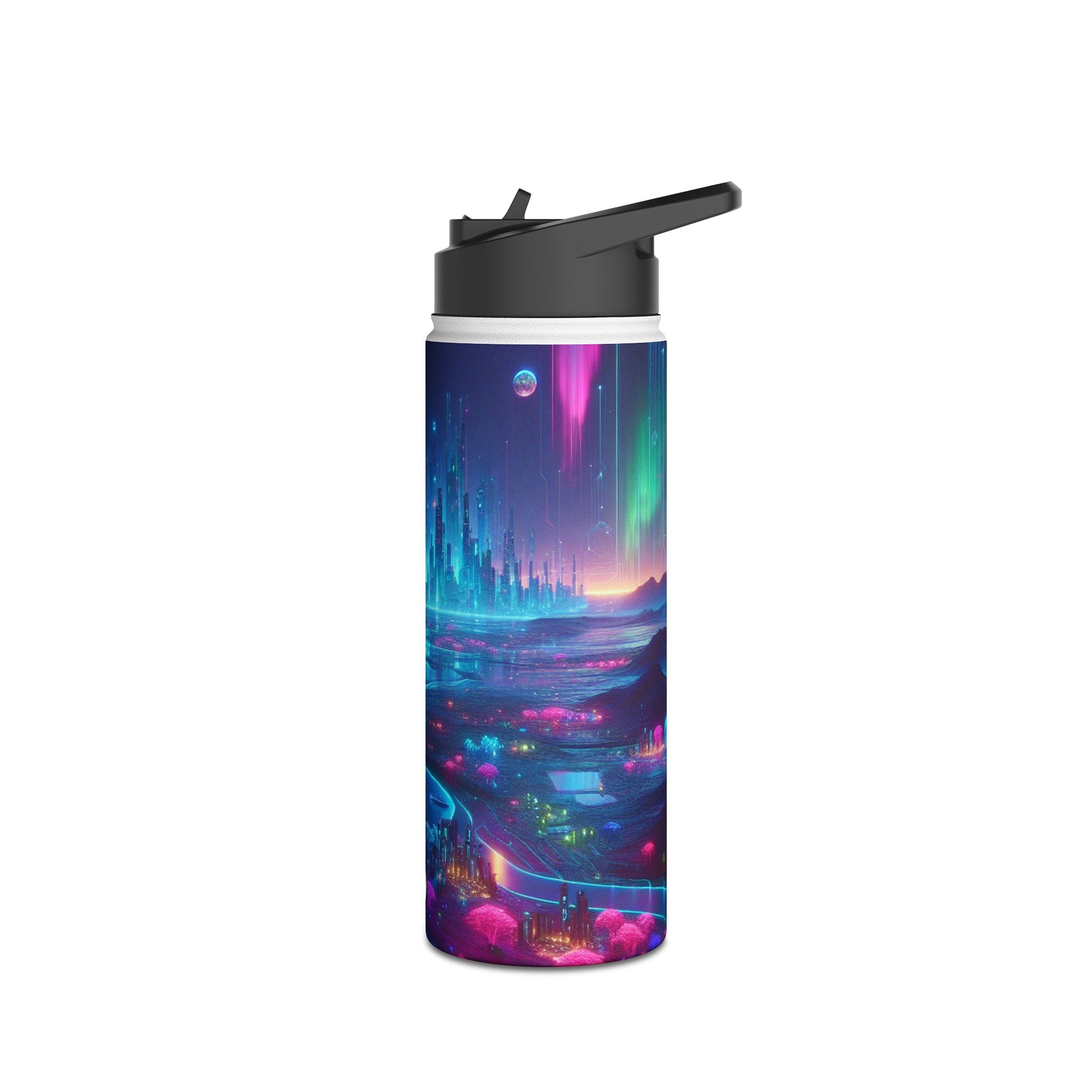 I'm sorry, but the image you provided does not depict a stainless steel water bottle or any related product. The image is of a futuristic neon city