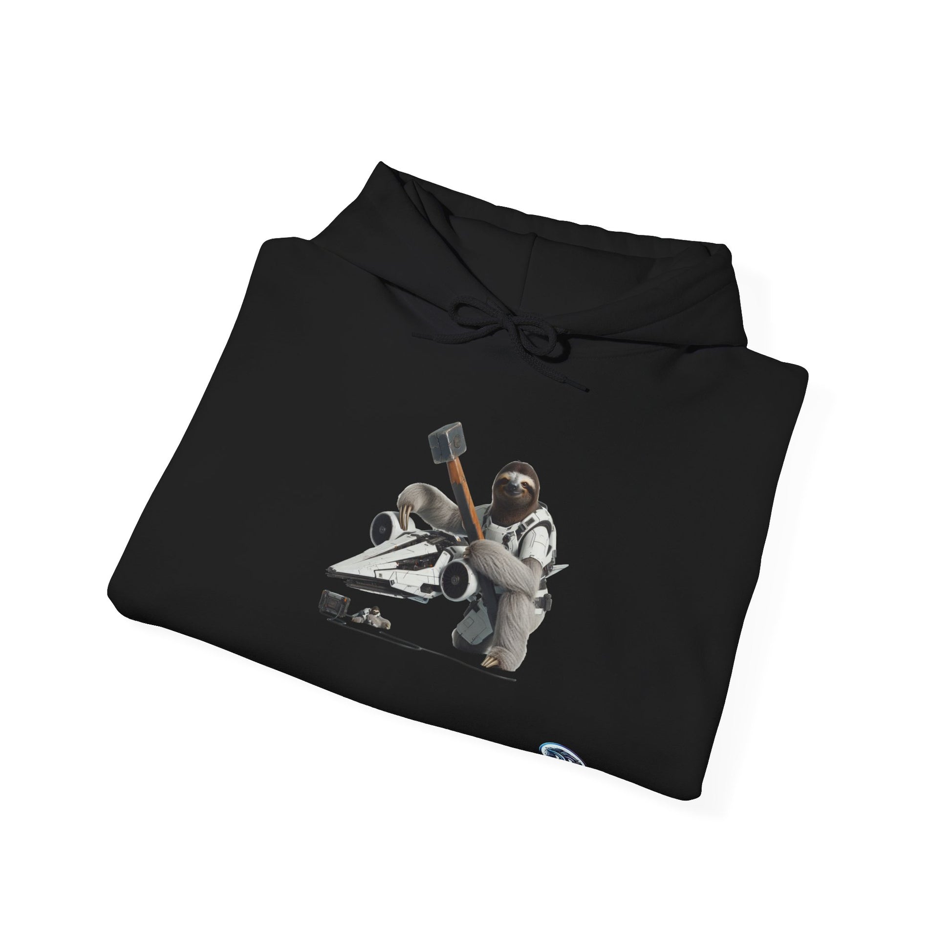 Introducing our one-of-a-kind hoodie featuring a futuristic space-bound sloth calmly fixing his spaceship with an oversized hammer. The sleek, advanced designs on the spaceship exude high technology, while the sloth's determined yet relaxed demeanor adds a touch of humor. Every detail finely rendered in this unique image that will surely make you smile. #FuturisticFashion #SpaceSloth #UniqueDesign #HighTechStyle #LaughOutLoud #ComfyHoodie #OriginalArtwork #SlothLife #SurrealFashion #SpaceHammer