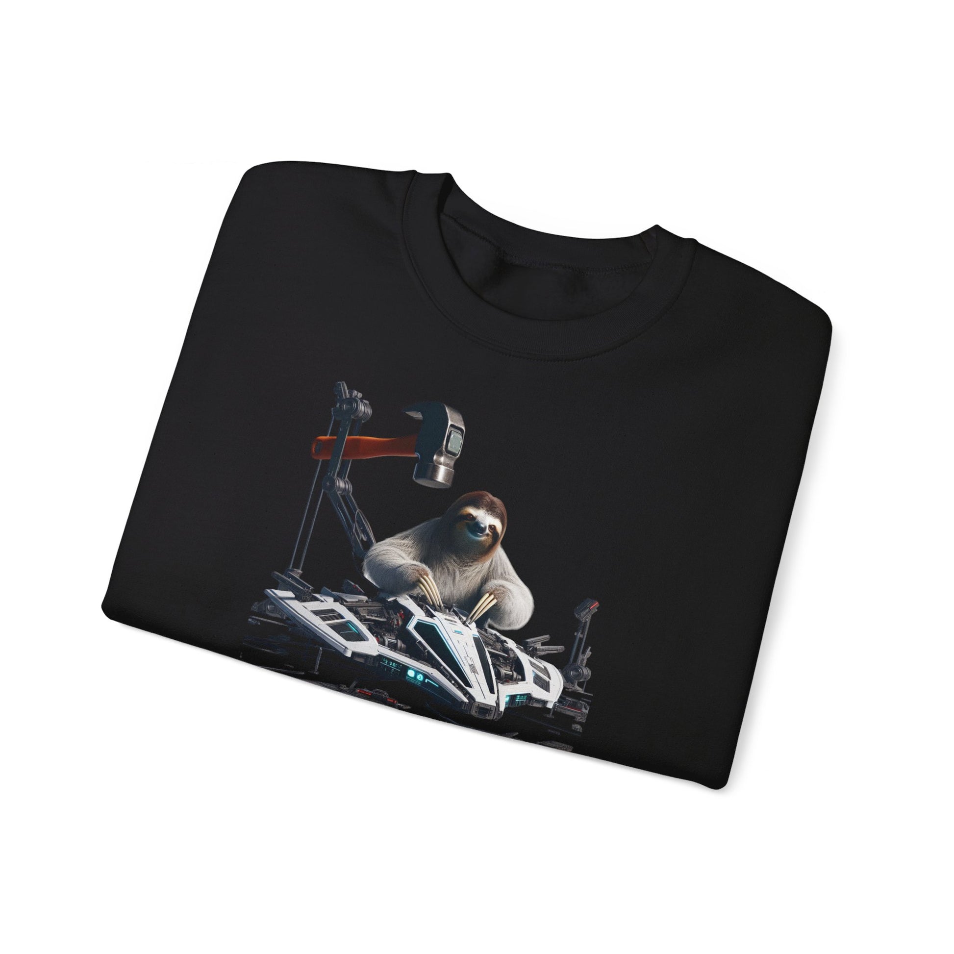Unleash your inner space explorer with our crewneck featuring a futuristic sloth fixing his spacecraft with a comically oversized hammer. The determined yet relaxed sloth is surrounded by sleek, advanced designs, all against a crisp white background. Get ready for an out-of-this-world adventure with this unique and playful design. #SpaceSloth #FuturisticFashion #FunnyCrewneck #HighTechStyle #SpaceAdventure #CuteAnimals #UniqueDesign #HumorousApparel #SlothLovers #FashionForward