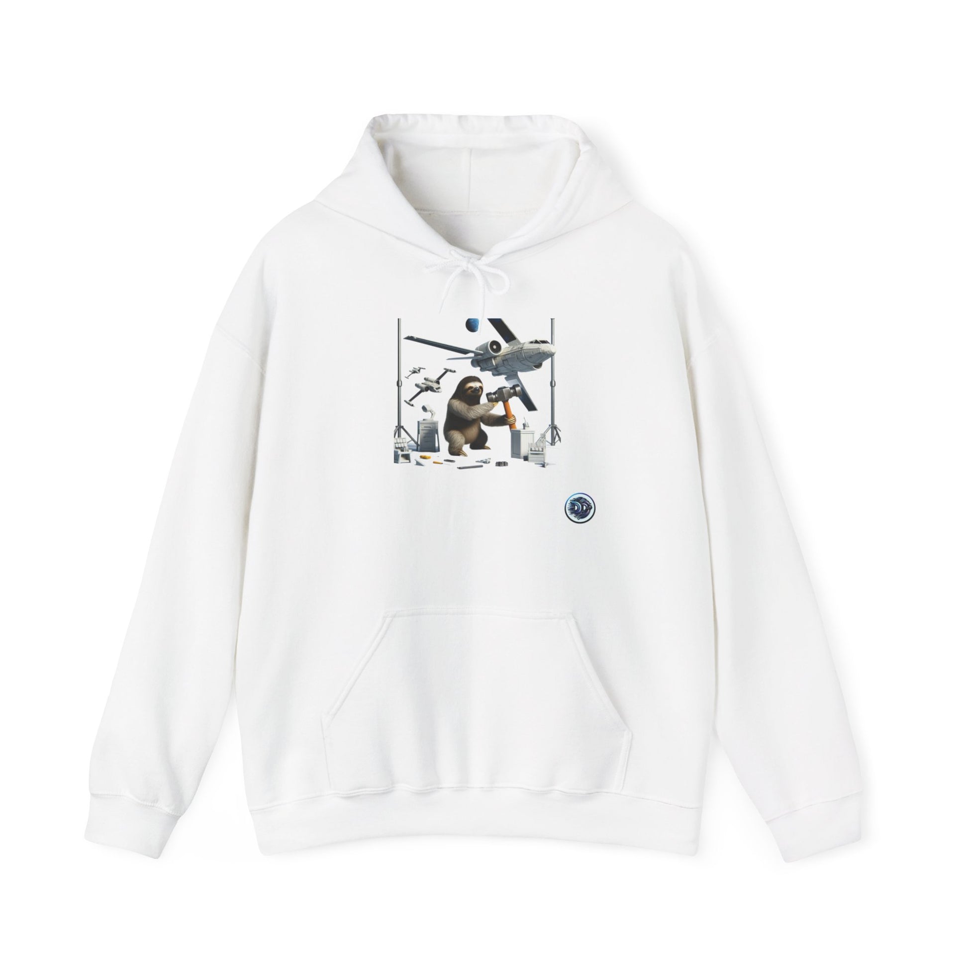 Introducing our one-of-a-kind hoodie featuring a futuristic scene! Picture a cool, determined sloth fixing his sleek spaceship with an oversized hammer. The design is both high-tech and hilarious, capturing the essence of adventure and fun. Get ready to stand out with this unique piece! #futuristic #spacebound #sloth #spaceship #hammer #funny #unique #hoodie #highquality #adventure