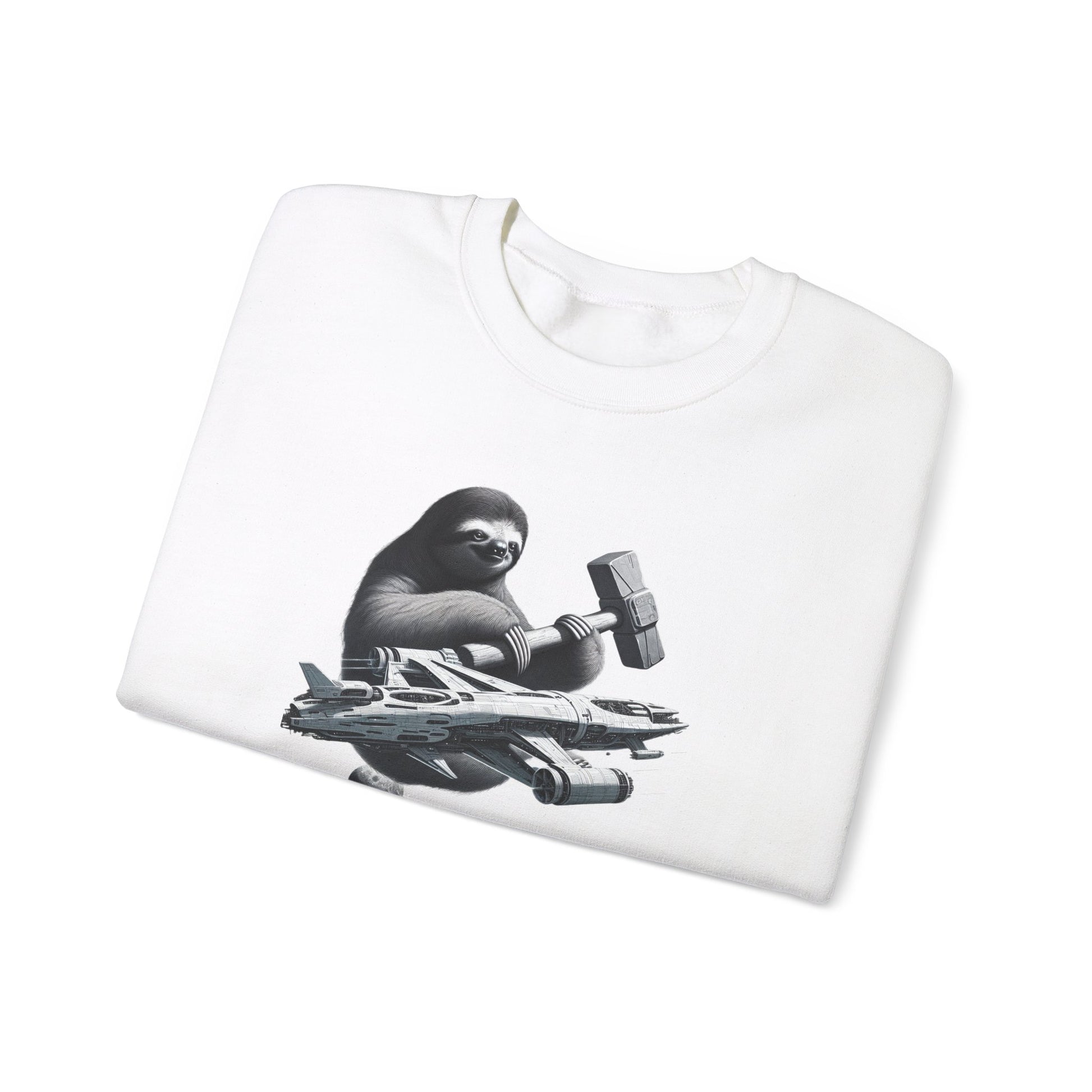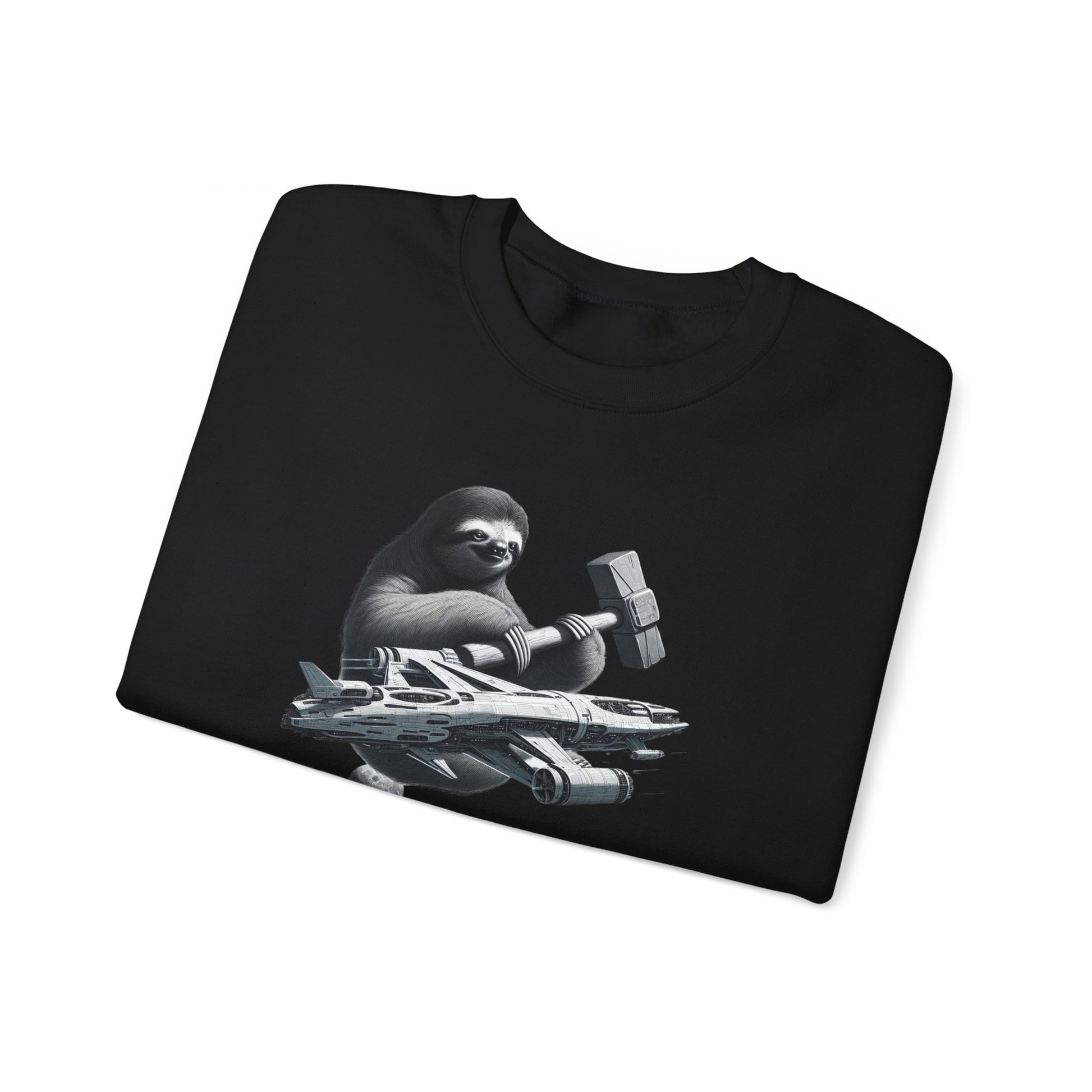Introducing our Crewneck featuring a futuristic space-bound sloth fixing his spaceship with an unusually large hammer. The sloth exudes determination yet remains relaxed as he repairs the sleek, high-tech spaceship. This design adds a humorous twist to your wardrobe. #SpaceSloth #FuturisticFashion #UniqueDesign #SlothInSpace #HumorousStyle #CreativeCrewneck #SpaceTraveler #FashionableFun #HighTechSloth #SlothSaga.