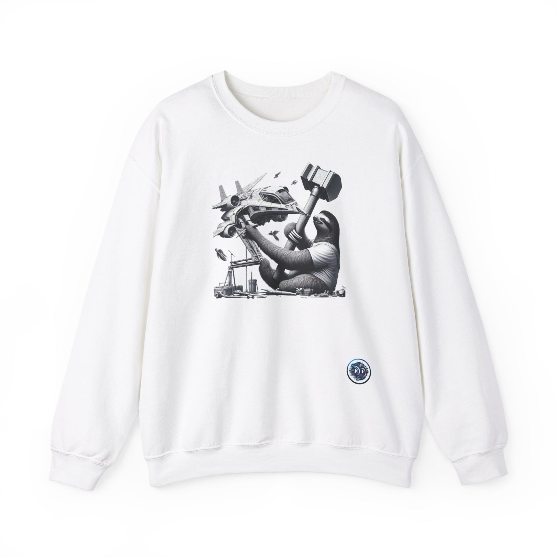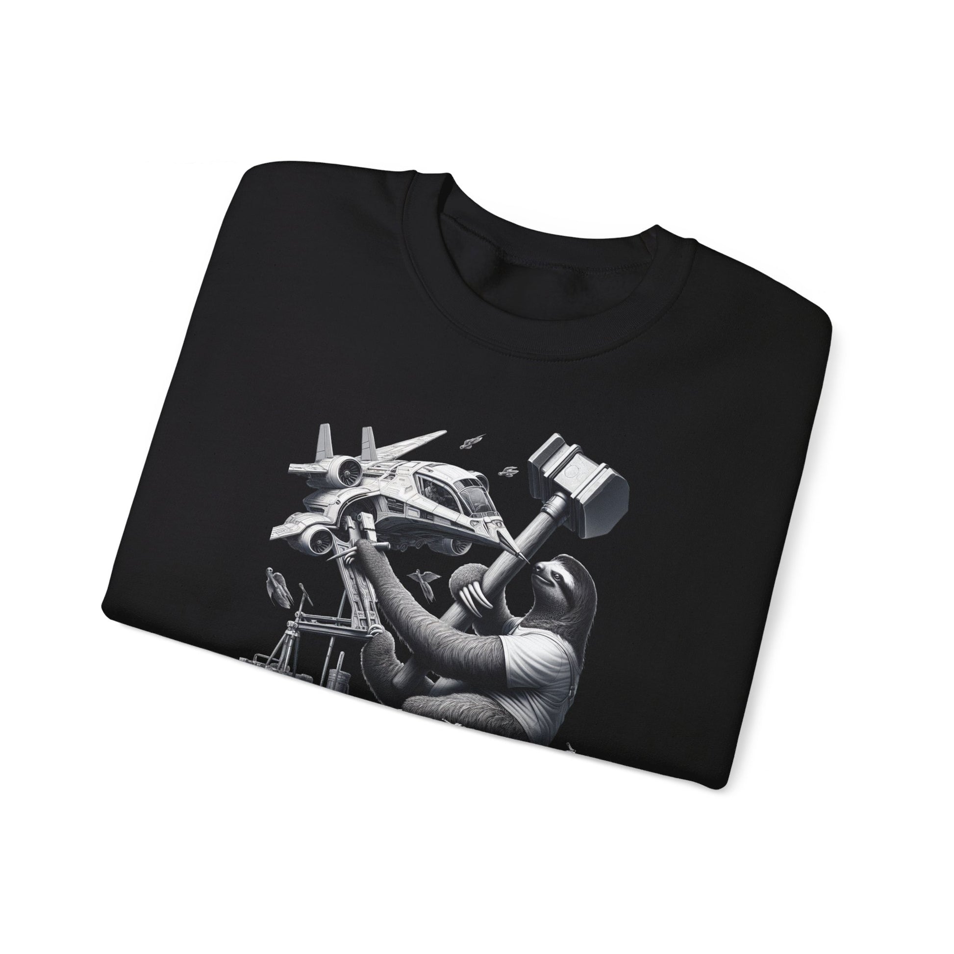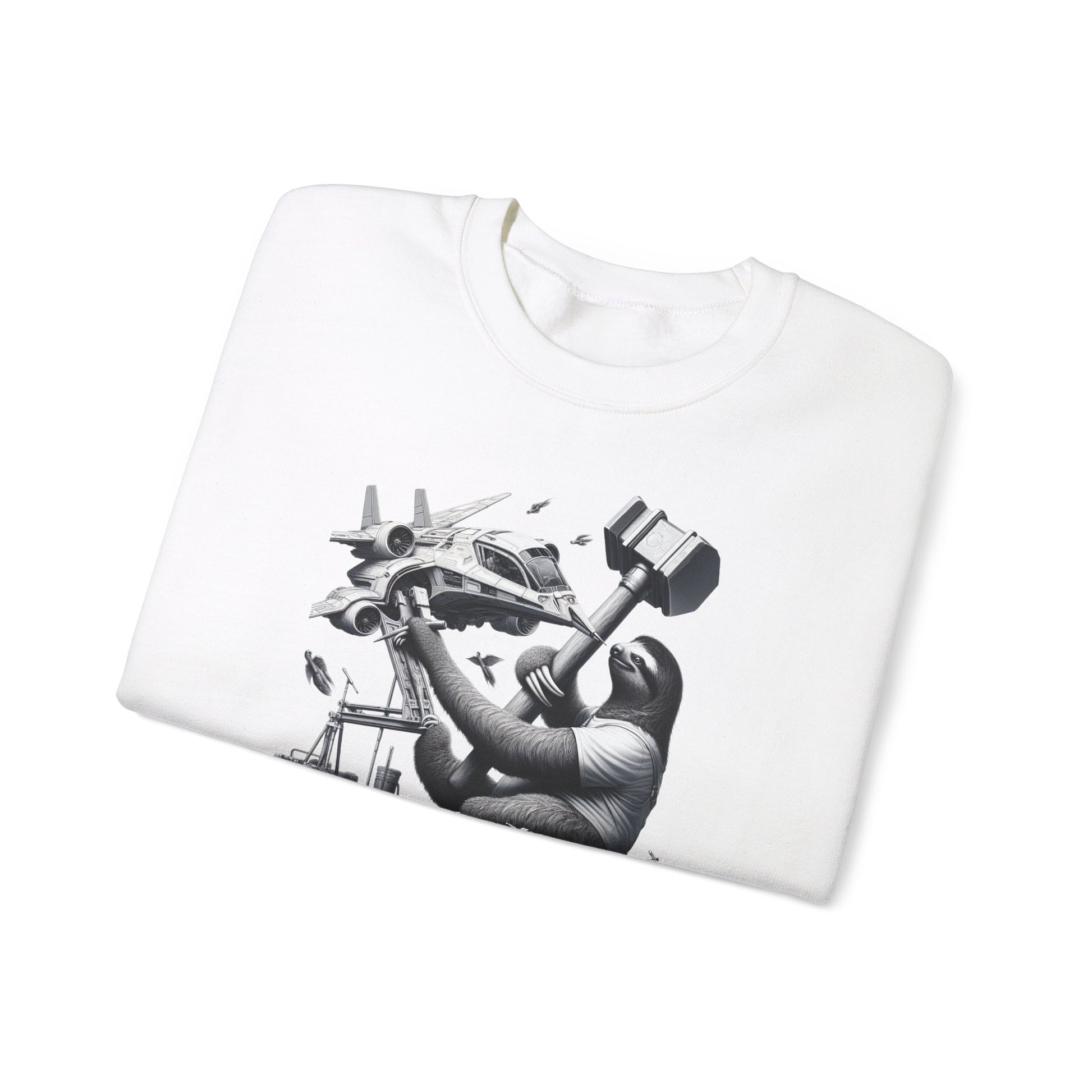 Introducing our Crewneck featuring a futuristic space-bound sloth! Picture a determined yet relaxed sloth fixing his sleek, high-tech spaceship with an unusually large hammer. This design is both humorous and captivating, with fine details that bring the scene to life. Get ready to embark on an out-of-this-world adventure with this unique crewneck! 🚀🦥 #SpaceSloth #FuturisticFashion #HumorousDesign #HighTechStyle #SleekSpaceship #DeterminedSloth #CreativeCrewneck #UniqueApparel #FunnyFashion #WhiteBackgroundArt